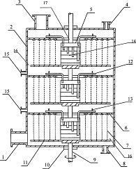 2.如权利要求1所述的同心圈逆流型超重力旋转床装置,其特征在于:所述转子为同轴连接的多层转子结构,其中最上层转子的第二通道口与所述的气相出口、液相入口相通,最下层转子的第一通道口与所述的气相入口、液相出口相通,其余转子的第二通道口与上一层转子的第一通道口相通。
