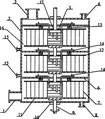 2、 如权利要求l所述的同心圈逆流型超重力旋转床装置,其特征在于:所述转 子为同轴连接的多层转子结构,其中最上层转子的第二通道口与所述的气相出口、 液相入口相通,最下层转子的第一通道口与所述的气相入口、液相出口相通,其余 转子的第二通道口与上一层转子的第一通道口相通。