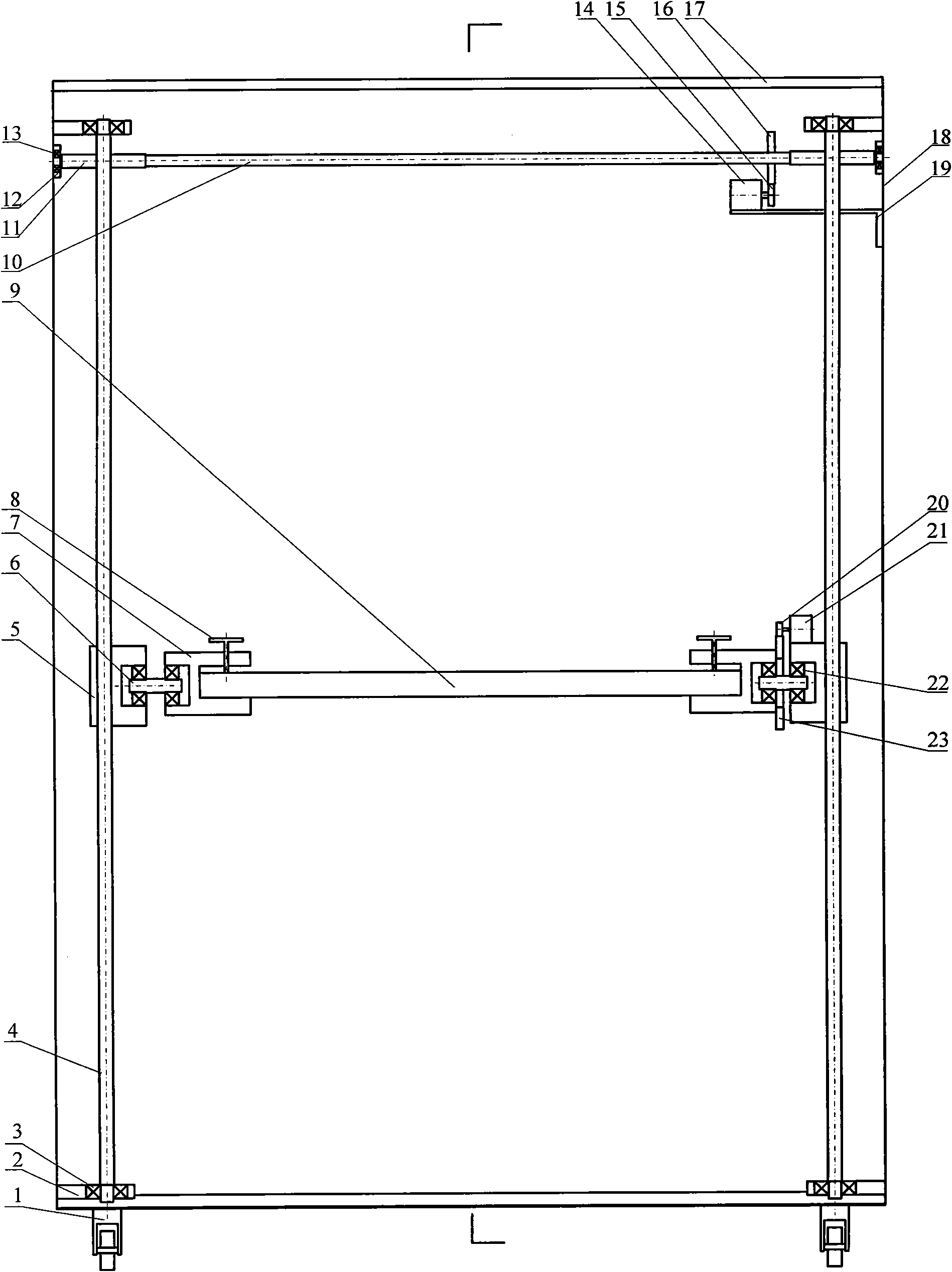 1.一种土壤剖面电导率测量装置,其特征在于:由四根连接杆和两块端板组成检测装置的框架,两根丝杆分别通过上下第一轴承和上下第一轴承座安装在各自的端板上,两个蜗轮分别固定在各自丝杆上方,两个滑块分别安装在两个蜗轮下方的两根丝杆上,两块固定块的一端分别通过连接轴和各自的第三轴承与滑块转动连接,土壤电导率检测仪安装在两块固定块的另一端之间,用调节旋钮固定,蜗杆通过第二轴承和第二轴承座安装在两块端板之间,第二齿轮固定在两根丝杆中的第一丝杆一侧的蜗杆上,蜗轮与蜗杆相啮合,第一步进电机通过第一步进电机支架固定在第一丝杆一侧的端板上,第一齿轮固定在第一步进电机的旋转轴上,第一齿轮与第二齿轮相啮合,第二步进电机固定在第一丝杆一侧的滑块上,第三齿轮固定在第二步进电机的旋转轴上,第四齿轮固定在第一丝杆一侧的滑块上,第三齿轮和第四齿轮相啮合,带动土壤电导率检测仪转动,四个脚轮安装在端板底部,电脑与土壤电导率检测仪相连。