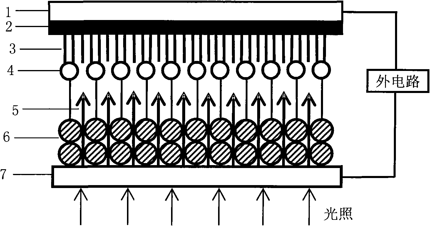 1.石墨烯复合染料敏化太阳能电池的光阳极,包括透明导电基底、形成在透明导电基底表面的半导体纳米晶膜、以及吸附在半导体纳米晶膜表面的染料层,其特征是:所述的半导体纳米晶膜是半导体纳米晶颗粒与石墨烯的复合薄膜,所述的石墨烯排列在所述的透明导电基底表面,并且所述的石墨烯的片状面与所述的透明导电基底表面之间的夹角不等于0°与180°。
