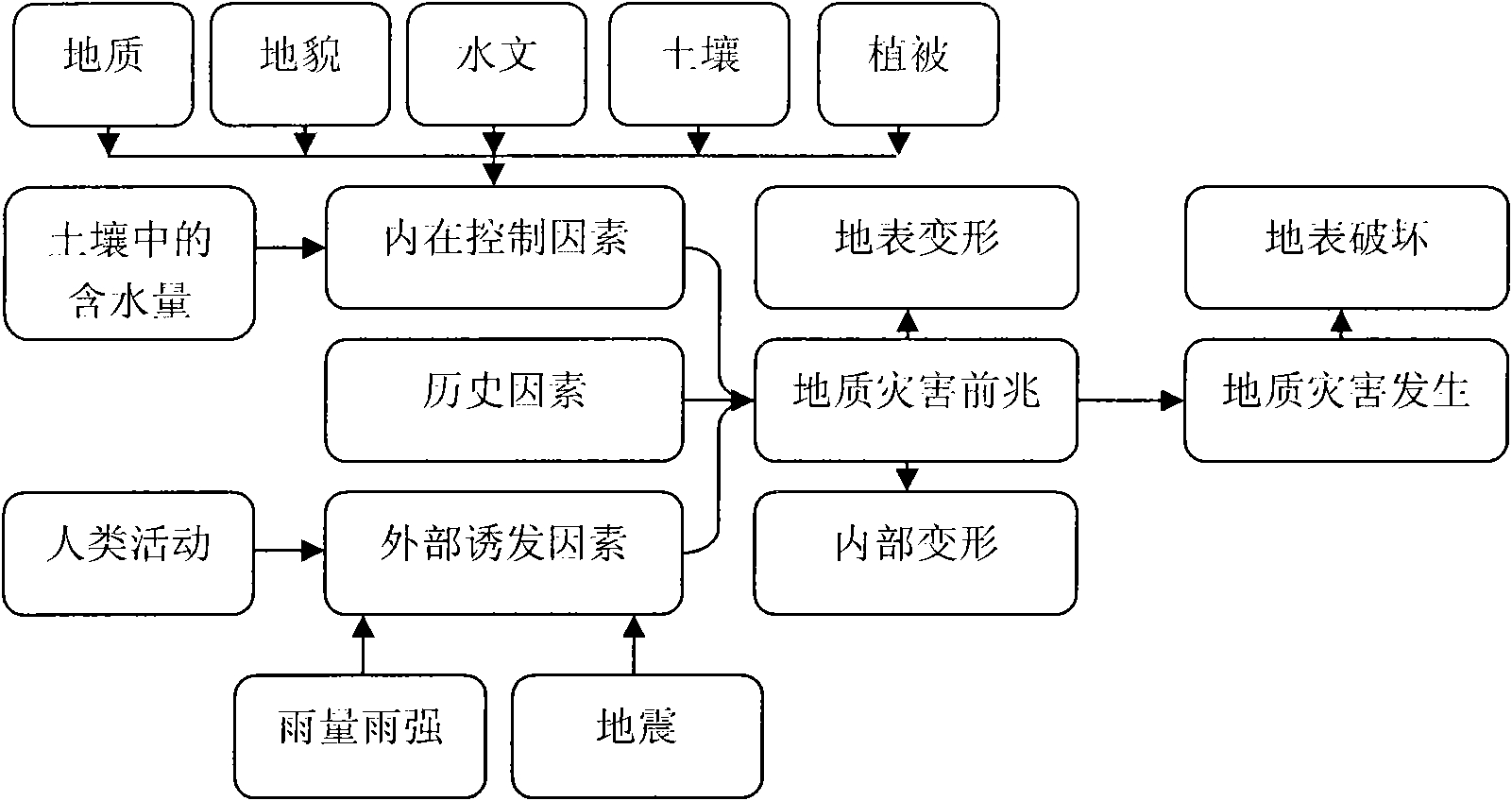 8.如权利要求1或2所述的基于雨量、斜坡土壤含水量和形变量的地质灾害预测系统,其特征在于:所述的自动雨量计获得每天和每小时雨量雨强的数据,并将数据实时地传输给所述的监控中心计算机。