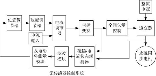 2.如权利要求1所述的永磁同步电机的无传感器控制系统,其特征在于:所述无传感器控制系统还包括滤波模块,所述磁链/电流状态观测器的输出连接所述滤波模块,所述滤波模块的输出连接所述反电动势测量模块;所述滤波模块包括低通滤波器和卡尔曼滤波器,所述卡尔曼滤波器的状态方程为: (16) (17)其中, 、 为 坐标系下 轴的反电动势的估计值, ,为卡尔曼滤波器的增益, 、 为经低通滤波器滤波后的电动势。