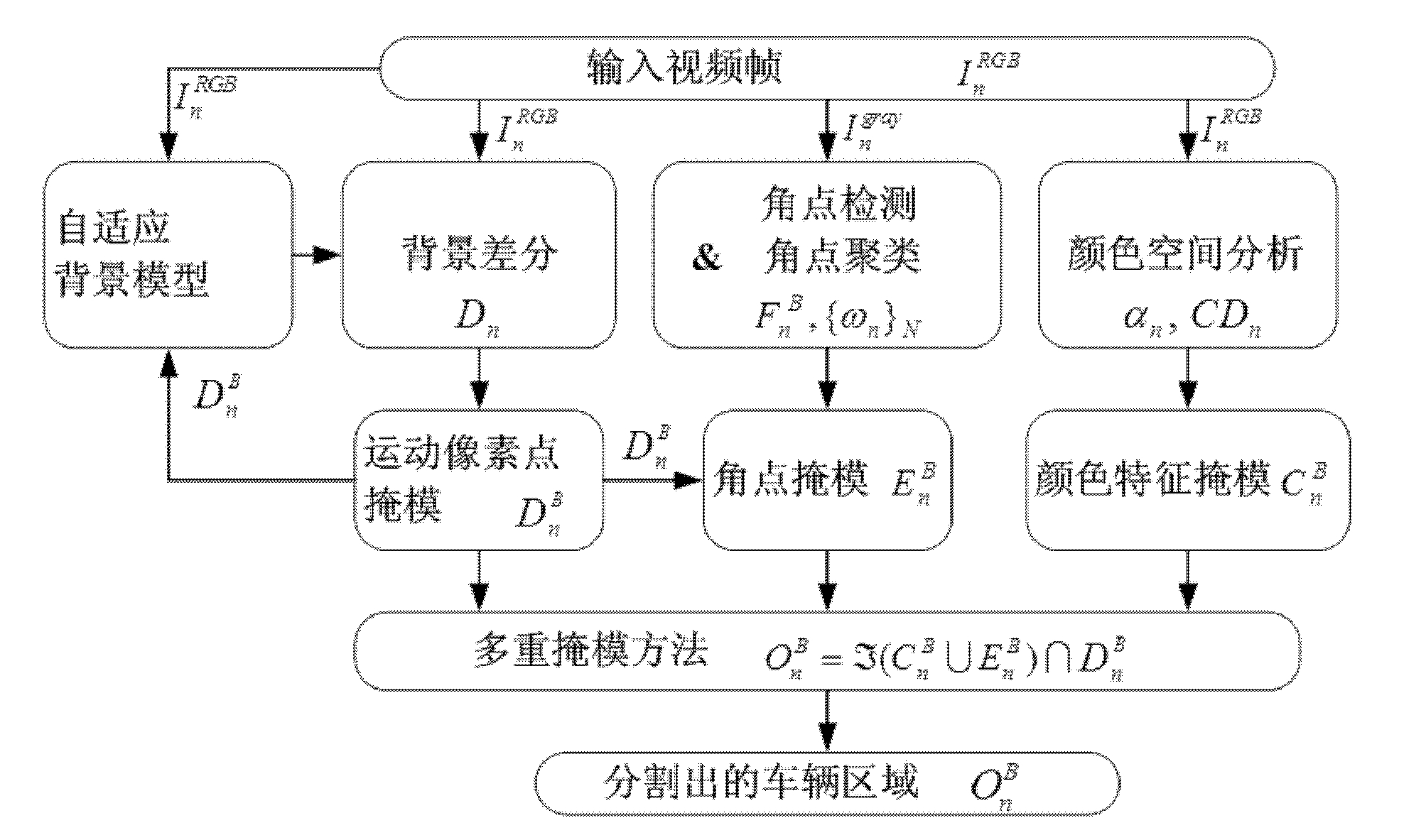 其中,(x,y) ∈{ωn}N 表示该点属于聚类空间集;(5)多重掩膜和车辆分割环节,通过对运动像素点掩膜模板、颜色特征掩膜模板、角点掩膜模板进行多重掩膜来得到最终的车辆像素,完成车辆的边缘分割;步骤(5)中多重掩膜和车辆分割环节中的多重掩膜公式如(11)所示:其中,由式(5)得到,由式(8)得到,由式(10)得到;是得到的最终车辆像素。