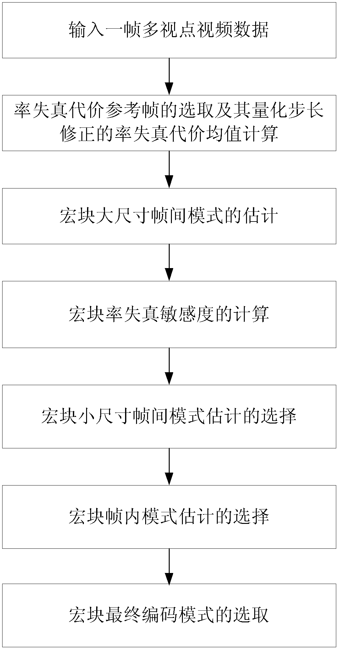 如果当前编码帧所在视点是基本视点,则将距当前编码帧时域方向最近的当前视点前向已编码帧选为率失真代价参考帧;如果当前编码帧所在视点是非基本视点,则将与当前编码帧具有同一采集时刻的邻近视点前向已编码帧选为率失真代价参考帧;在选定率失真代价参考帧之后,计算该帧的量化步长修正的率失真代价均值QRDAVG,如式(I)所示:式(I)中,N是所选率失真代价参考帧的宏块个数,i是宏块索引,QstepMB是宏块i的编码量化步长,RDMB是宏块i最终编码模式的率失真代价;