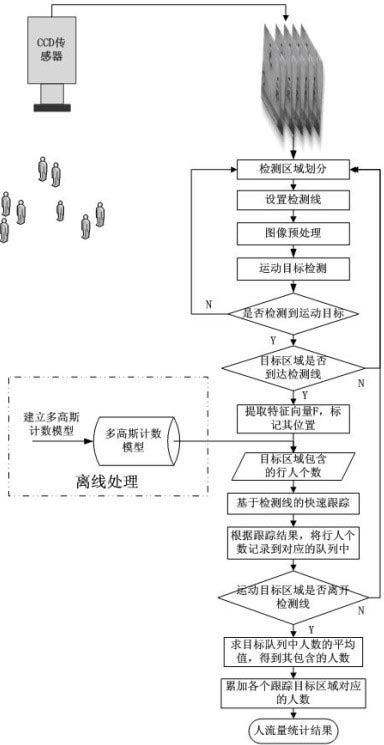 2.根据权利要求1所述的人流量统计方法,其特征在于,获得运动目标区域包含的人数后,采用快速目标跟踪关联方法获得该目标区域对应的计数队列,并将当前运动目标人数存入该队列,当目标离开检测线时,计算队列的平均值得到该目标区域包含的人数。