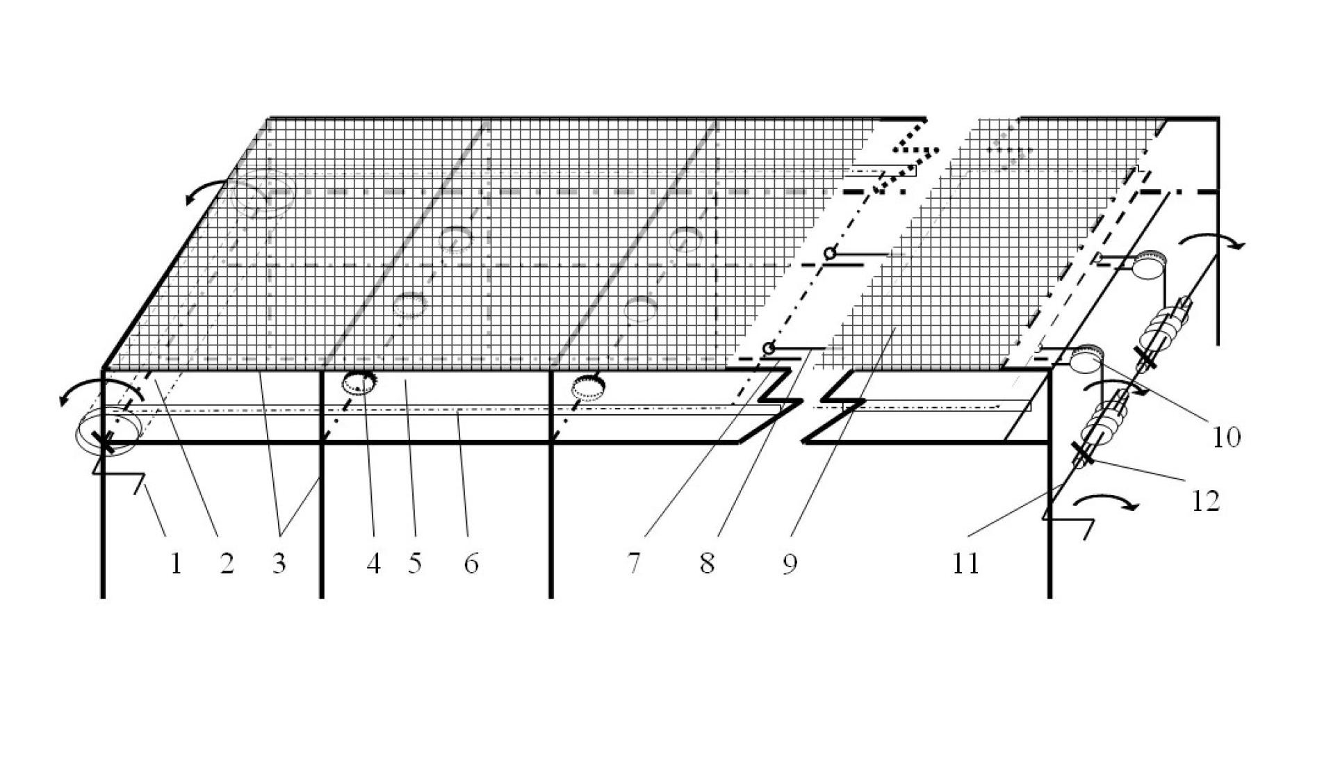 1.手动式鸭舍粪便收集装置,其特征在于包括支架(3),在支架(3)的上表面从下到上依次固定钢丝网(7)和耐碱型玻璃纤维网格布(9),在支架(3)两侧固定有卡条(6),卡条(6)位于钢丝网(7)和耐碱型玻璃纤维网格布(9)之间,在支架(3)一端固定带摇把(1)的主动轮(2),在支架(3)另一端固定带凹槽滑轮(10),在带凹槽滑轮(10)的下方设有带插栓(12)的转轴(11),在与主动轮(2)平行的钢丝网(7)的钢丝上套有滑轮(4),在钢丝网(7)和耐碱型玻璃纤维网格布(9)之间设有高密度聚乙烯膜传送带(5),高密度聚乙烯膜传送带(5)两侧位于卡条(6)内,高密度聚乙烯膜传送带(5)的一端连接主动轮(2),另一端与拉绳(8)的一端相连,拉绳(8)置于带凹槽滑轮(10)的凹槽中,拉绳(8)的另一端连接转轴(11)。