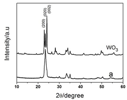 水到含W2O7 溶液至体积为100mL,得到澄清的电解液;以ITO导电玻璃为工作电极,铂片电极为对电极,饱和甘汞电极为参比电极,置于电解液中进行电沉积,相对于甘汞电极的阴极电位为-0.4~ -0.6V, 沉积时间为60分钟,得到无定形氧化钨薄膜,晾干备用;