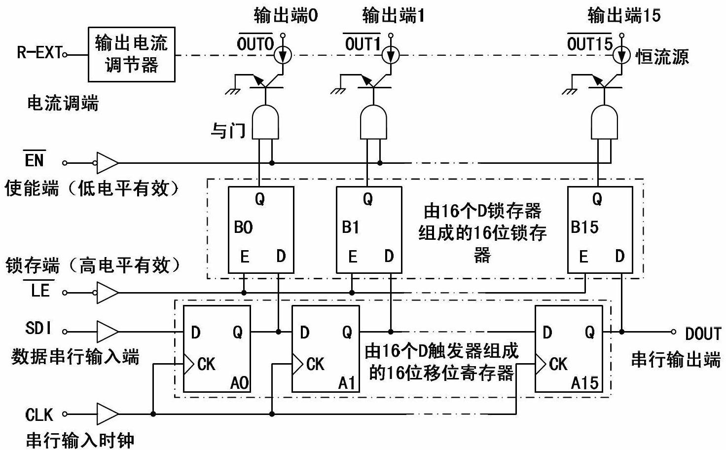 4.根据权利要求1所述的实现LED恒流驱动器灰度等级可控的方法,其特征在于:所述清零是采用n个带有复位端的D触发器作为组成数据缓存区的数据缓存器,将n位数据缓存器的n个D触发器复位端与复位信号R相连,复位信号R是与CLK协同工作的周期性变化的公共复位信号,需要的灰度等级位数为m时,将复位信号R的频率调节为相应的值,使每隔m个移位CLK信号后产生一个R的低电平脉冲信号使缓存器清零,而在移位数据时R信号一直保持为高电平,以使缓存器按照所需要的时序与频率进行整体复位,当新数据从高权重位移入后可以保证低权重为之前清零操作后的零数据,从而使输入到计数比较模块内的数据为选择清零操作后的数据。