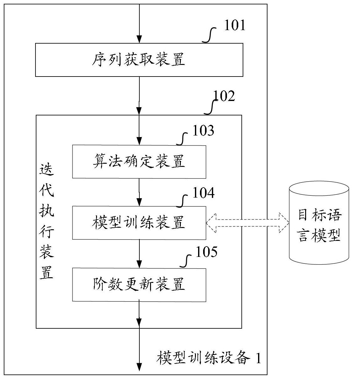 迭代执行装置,用于设置所述目标语言模型的初始阶数信息以作为其当前训练阶数,并结合所述目标语言模型的最高阶数信息,迭代执行以下装置所执行的操作,直至所述当前训练阶数超过所述最高阶数信息:算法确定装置,用于根据所述当前训练阶数,确定与所述目标语言模型相对应的平滑算法;