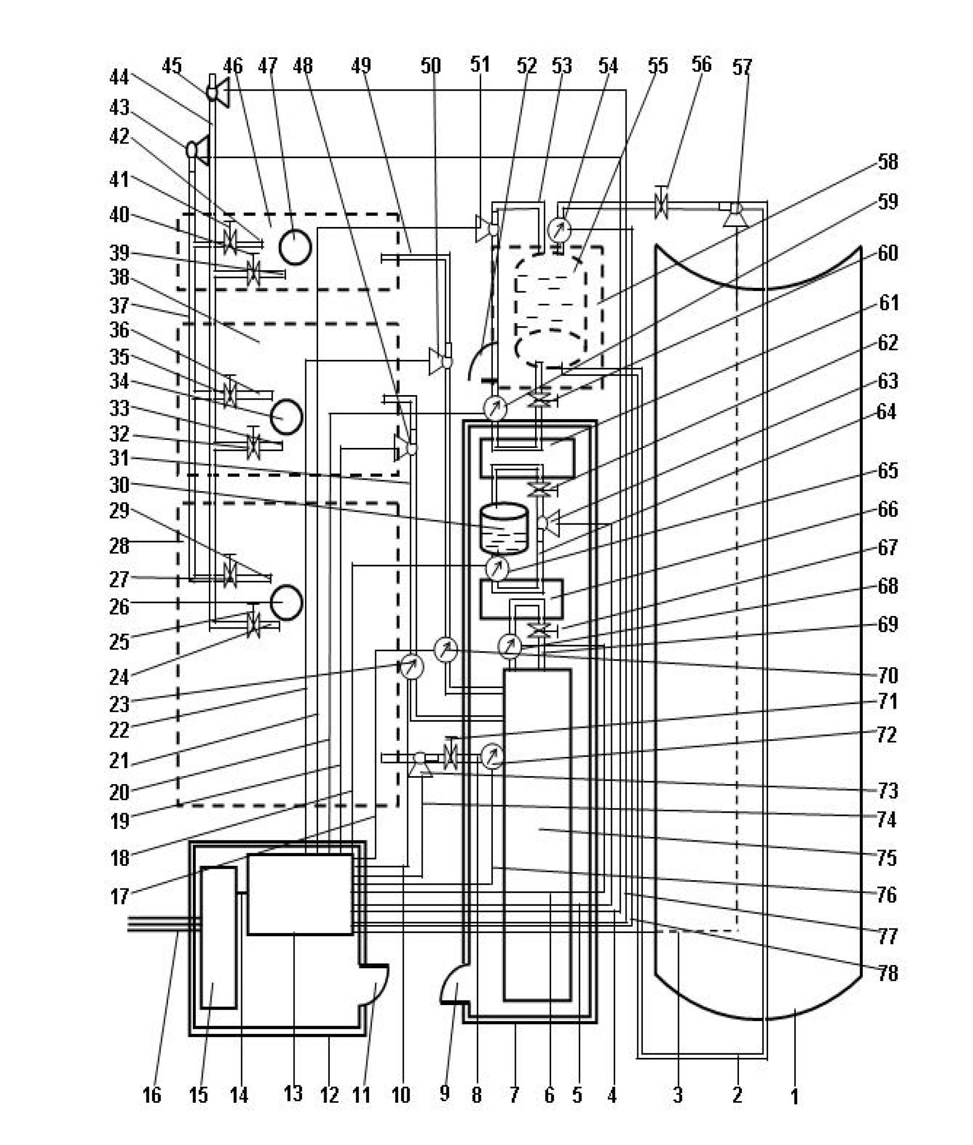 引进电线一端与外界V的电源电压相接,另一端与配电设备输入端相接,配电设备输出端通过配电线接控制设备的输入端,控制设备的输出端接有第一控制线、第二控制线、第三控制线、第四控制线、第五控制线、第六控制线、第七控制线、第八控制线、第九控制线、第十控制线、第十一控制线、第十二控制线、第十三控制线、第十四控制线、第十五控制线;第一控制线、第二控制线、第三控制线、第四控制线、第五控制线、第六控制线、第七控制线、第八控制线、第九控制线、第十控制线、第十一控制线、第十二控制线、第十三控制线、第十四控制线、第十五控制线的另一端分别与第六离心泵、第一离心泵、第七离心泵、第五流量与温度计、第一流量与温度计、第六流量与温度计、第四流量与温度计、第三离心泵、第三流量与温度计、第五离心泵、第四离心泵、第八离心泵、第二离心泵、第二流量与温度计相连接;