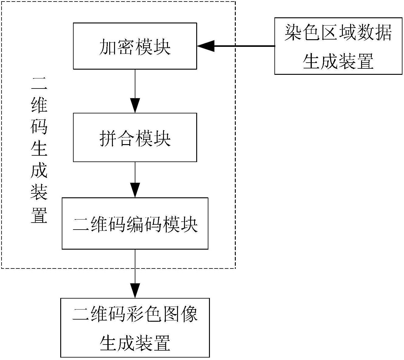 二维码彩色图像生成装置,根据染色区域数据生成装置的数据对二维码生成装置生成的二维码黑白图像进行染色,得到局部染色的二维码彩色图像。