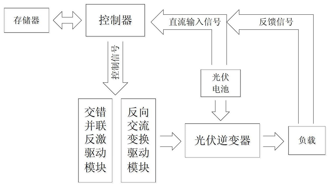 所述控制器中,将输出电压信号按设定大小等分,每一等份电压与输入的比值确定一个对应的占空比;先对占空比进行初始化,当直流输入信号发生波动,计算变化后的占空比,对数据进行更新;当输出电压信号发生波动,通过PI调节,改变占空比,保证稳定的交流输出。