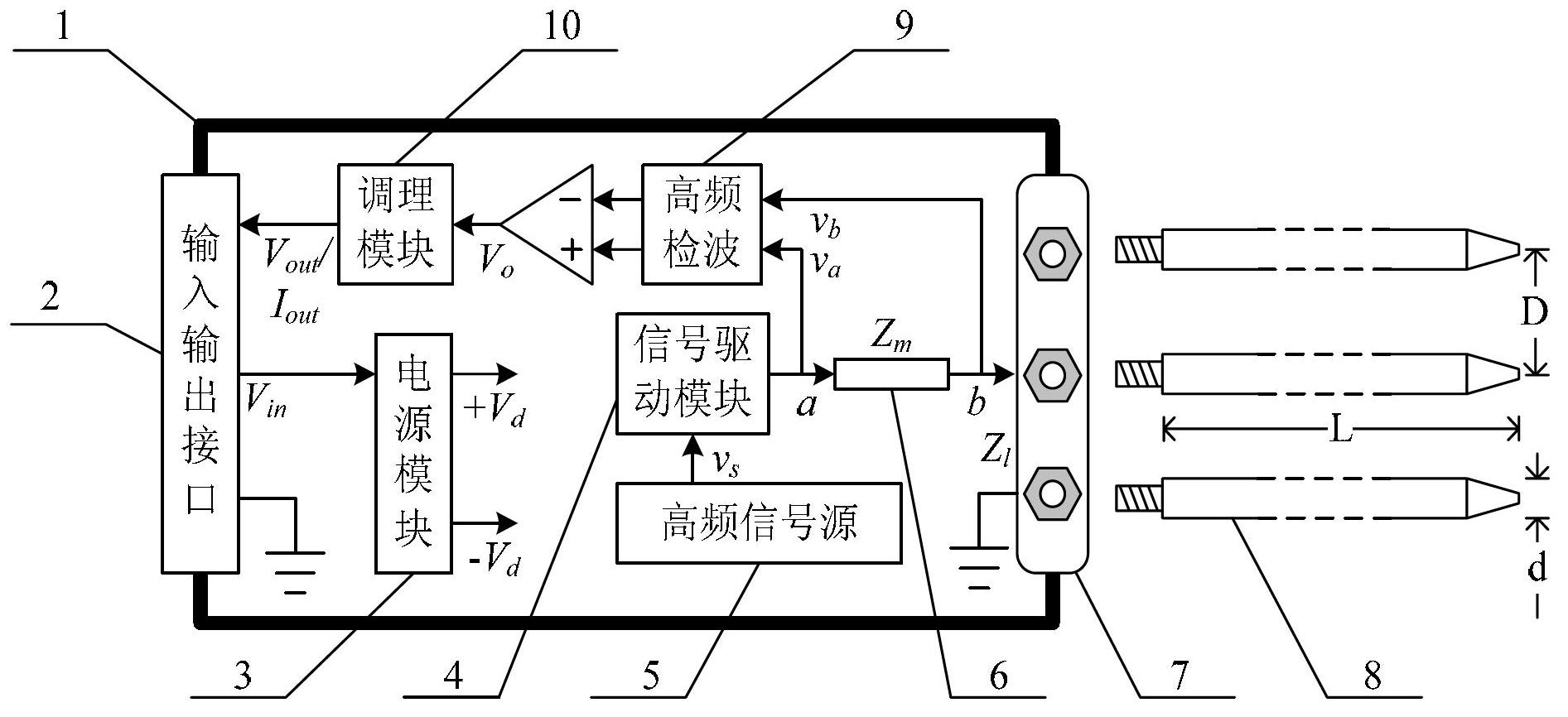 1.一种探头可替换的土壤水分传感器的测量方法,其特征在于,包括以下步骤:(1)首先在满足以下约束条件下确定一组探针的长度和直径,其中L为探针的长度,ε为含水土壤的等效介电常数,f为激励信号频率,c为电磁波在真空中的传播速度;