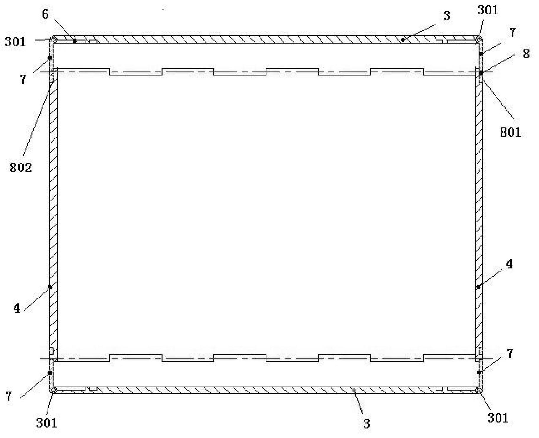 1.一种可变规格周转箱,其特征在于:包括箱子底板(1)和搭接结构(8),所述搭接结构(8)由搭接凹槽(801)和搭接凸起(802)组成,所述箱子底板(1)长侧两边通过第一插销(201)与长侧下板(2)连接,所述长侧下板(2)通过第二插销(202)与长侧上板(3)连接,所述箱子底板(1)宽侧两边与宽侧下板(4)垂直固定,所述宽侧下板(4)两边设置有搭接凹槽(801),顶端通过第三插销(401)与宽侧翻折上板(5)连接。