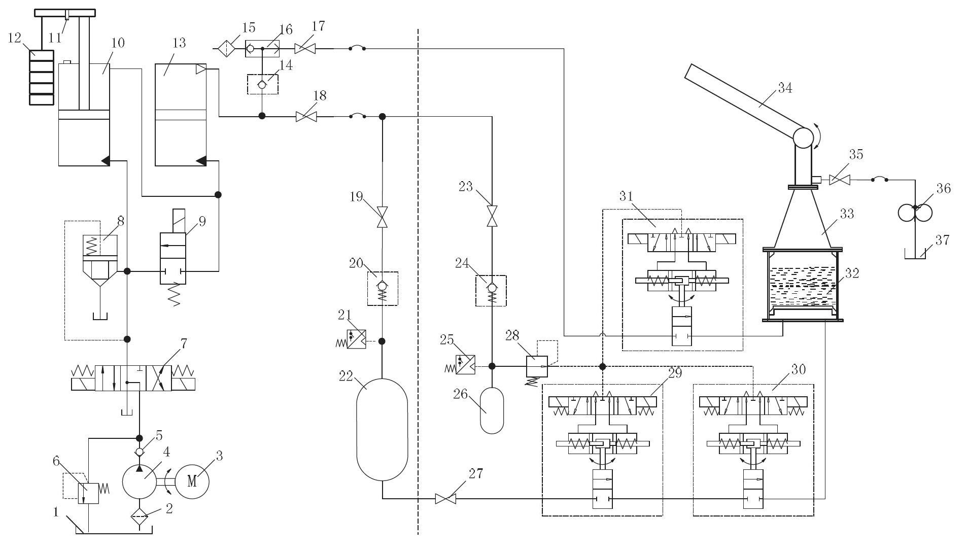 1.一种超远程高压脉冲水炮,包括蓄能器和水炮,所述水炮包括上部炮体、锥形容器和射水缸,所述蓄能器通过第一高压球阀与所述射水缸的下部空气腔连通,所述射水缸上安装锥形容器,所述锥形容器的上端与炮体连通,所述锥形容器上连接进水机构,其特征在于:所述超远程高压脉冲水炮还包括油箱、单出杆油缸和气液缸,所述油箱的出油口通过液压泵、单向阀与三位四通换向阀连接,所述油箱的回油口通过溢流阀与三位四通换向阀连接,所述三位四通换向阀通过插装单向阀与所述单出杆油缸的无杆腔连通,所述单出杆油缸的活塞杆的另一端安装在连接杆的一端,所述连接杆与活塞杆垂直布置,所述连接杆的另一端安装用以带动活塞向无杆腔移动的加载重块,所述单出杆油缸的有杆腔与所述气液缸的液体腔连通,所述气液缸的气体腔的进出气口通过安全阀、压力继电器与所述蓄能器连接,所述气液缸的气体腔的进出气口同时与吸气阀、气动梭阀和空气滤清器连接。