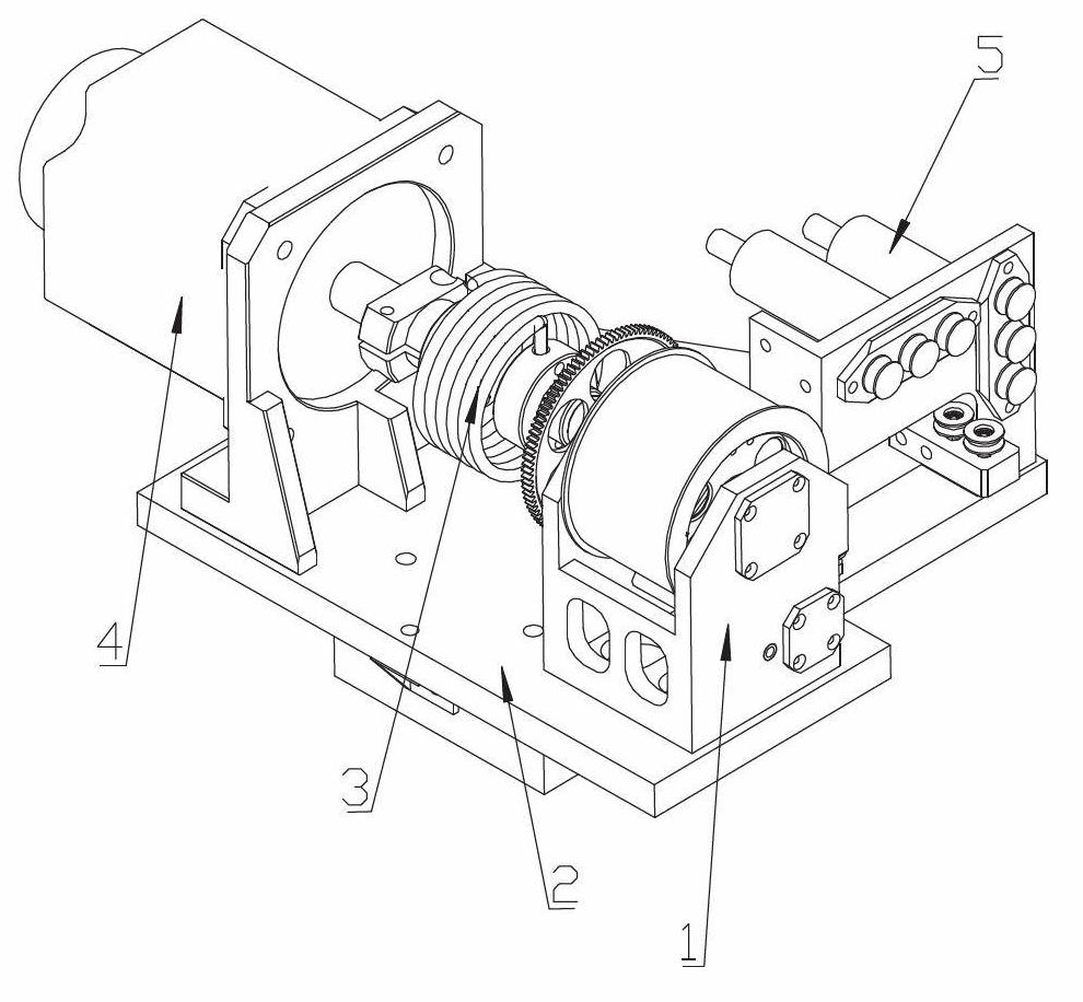 所述卷绳组件包括卷绳组件座、丝杠,卷绳轴、卷筒、大齿轮、导向轮和小齿轮,所述卷筒固定安装在卷绳轴上,所述卷绳轴通过键槽与大齿轮连接,所述大齿轮与小齿轮啮合,所述小齿轮与丝杠通过键槽连接,所述卷绳轴与丝杠两端通过滚动轴承安装在卷绳组件座上,所述导向轮通过安装板固定卷绳组件座上,所述卷绳组件座固定安装在安装支架上。