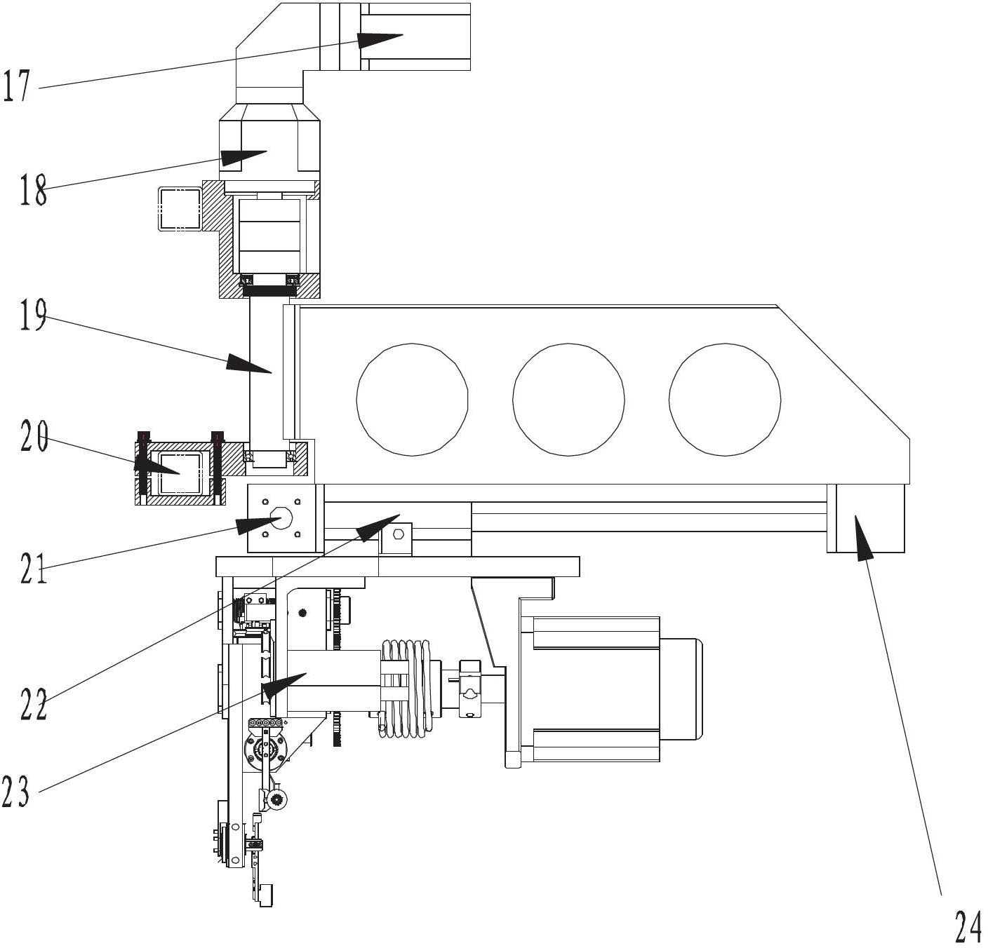 所述二维主动跟随系统包括导轨滑块、线性模组、导轨横梁、转轴、旋转梁、第一控制电机、第二控制电机、横向角度感应组件和纵向角度感应组件,所述导轨滑块与恒张力控制系统中的安装支架底部相连接,所述第一控制电机安装在线性模组的一端,所述导轨滑块可滑动地安装在所述线性模组上,所述线性模组固定在导轨横梁上,所述导轨横梁末端与转轴固定,所述转轴通过轴承套装在上下旋转梁座上,所述转轴与所述第二控制电机的输出轴联动,所述横向角度感应组件和纵向角度感应组件安装在所述安装支架上,所述横向角度感应组件和纵向角度感应组件之间空间上呈90度。