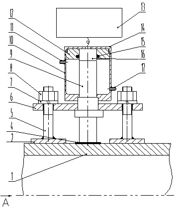 夹(2)、四个螺柱(5)、导波杆(9)、压板(6)、铜片(4)、压盖(14)、柱塞(12)、氟橡胶密封圈(15)、水冷套(10)、超声波测厚主机(13)和超声波探头(16);高温管道(1)夹持在两副均由两半圆环组成的管夹(2)内固定连接,其中同侧的两半圆环管夹分别焊接两个螺柱,使四个螺柱(5)呈方形;方形的四个螺柱(5)中部设置有阶梯形的导波杆(9),朝向高温管道(1)一侧的导波杆(9)端面设有铜片(4),四个螺柱(5)和阶梯形的导波杆(9)穿过压板(6)后,四个螺柱(5)分别用弹簧垫圈(7)和螺母(8)固定并压在导波杆(9)的轴肩上,背离高温管道(1)一侧的导波杆(9)端面设置超声波探头(16),导波杆(9)和超声波探头(16)均位于水冷套(10)内,水冷套(10)下端阶梯孔与导波杆(9)轴肩过盈配合,超声波探头(16)位于柱塞(12)中心孔中,用氟橡胶密封圈(15)密封,水冷套(10)上端大孔与柱塞(12)固接,压盖(14)与柱塞(12)螺纹连接,压盖(14)压在超声波探头(16)端面,超声波探头(16)通过电缆线与超声波测厚主机(13)连接;水冷套(10)上下分别有出水口(11)和进水口(17)。