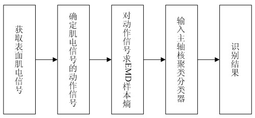1.基于EMD样本熵的表面肌电信号识别方法,其特征在于该方法包括如下步骤: 步骤(I).获取人体上肢肌电信号样本数据,具体是:首先通过肌电信号采集仪拾取人体上肢肌电信号,再运用能量阈值确定动作的起始位置和终止位置作为动作肌电信号;步骤(2).将步骤(I)获取的动作肌电信号信号进行经验模态分解,然后依据频率有效度的方法自适应的选取若干个包含肌电信号有效信息的内蕴模式函数分量进行迭加作为有效肌电信号;具体如下: 1)对肌电信号,用经验模态分解,分解成各内蕴模式函数分量之后,如下式所示; ^')=^€//)+ φ) /=1 式中:c/0为第个内蕴模式函数分量;(O为余项; 2)为了自适应的选取前若干个内蕴模式函数分量,设计基于瞬时频率的有效信息统计法,定义第i层的内蕴模式分量的频率有效度Si =HiSn ;其中,%为MFi中瞬时频率落在2(Γ350范围内的点数,η为总的信号采样点数,Bi表示在指定频率段的有效信息量;由于经验模态分解的各层内蕴模式分量的频率逐层减小,它们的频率有效度也各不相同,因而通过设定频率有效度马的值可以选取不同的前若干个内蕴模式分量; 3)依据频率有效度的方法自适应的选取若干个包含肌电信号有效信息的内蕴模式函数分量进行迭加作为有效肌电信号; 步骤(3).将步骤(2)获取的有效肌电信号进行特征提取,求取其样本熵作为肌电信号特征; 步骤(4).以步骤(3)所求得的样本熵作为特征向量输入基于主轴核聚类算法的聚类分类器,获得识别结果; 所述的主轴核聚类算法的聚类分类器设计如下: 根据肌电信号样本熵分布特征,设计基于样本和核的相似性度量的算法一主轴核聚类算法,具体是: 设一个J维矢量样本集Z =(½¾/-,类别数为e,定义主轴核函数为: K-j (^. = ^ J — 1,2,-- ■ ,C 式中:Vj' = (Ui^ti),设%为第头的子集,则式为子集%的均值,Si为%的协方差矩阵,轴%=('〜“')是样本协方差矩阵爲的七个最大特征值所对应的本征向量系统,其中七表示j类动作的维数; 任一样本X与一个轴%之间的相似程度可以用ζ与μ头主轴之间的欧氏距离的平方来度量: L2 (x,Kj-) = [(J - Uj) - Uj-U](x-Uj)f [(J-Uj) - U/J] Cx-¾.)] 式中4是巧类样本的均值向量;任一样本 与某个类主轴的欧氏距离不受特征量纲选取的影响,并且平移不变,而且也反应了特征的相关性;通过对训练数据的聚类分析,用已知动作训练集分别求取的每个动作的主轴核函数为相应类的聚类主轴,每个聚类主轴都是一个rf维矢量;如果给定矢量属于第J类,那么它到第J类聚类主轴的欧氏距离最小;因此,如果要判定矢量属于哪一类,只要计算它到哪一类聚类主轴的欧氏距离最小即可。