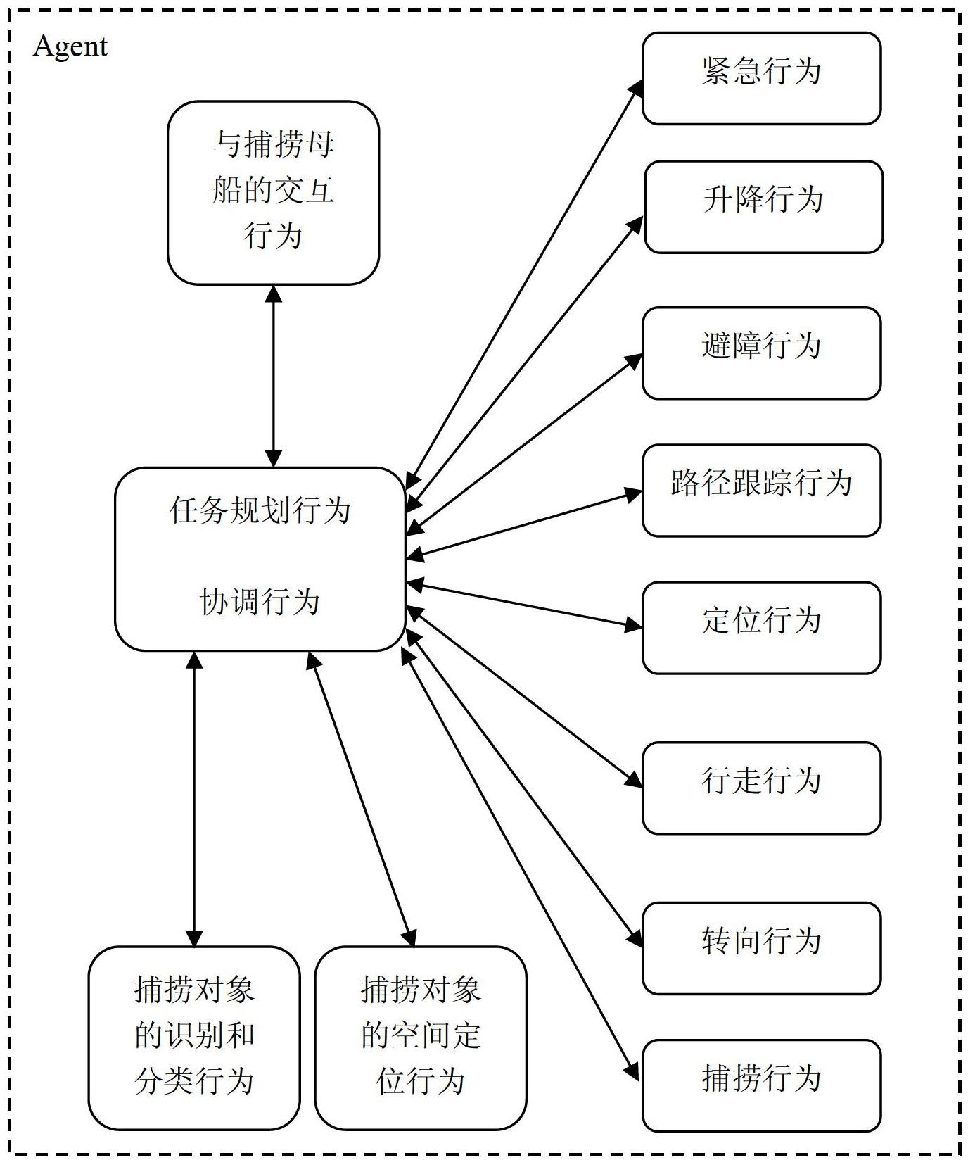 所述的Agent驻留在所述的捕捞机器人中,所述的Agent包括任务规划行为模块、协调行为模块、与捕捞管理人的交互行为模块、紧急行为模块、升降行为模块、避障行为模块、定位行为模块、路径跟踪行为模块、行走行为模块、转向行为模块、捕捞对象的识别行为模块、捕捞对象的空间定位行为模块和捕捞行为模块;