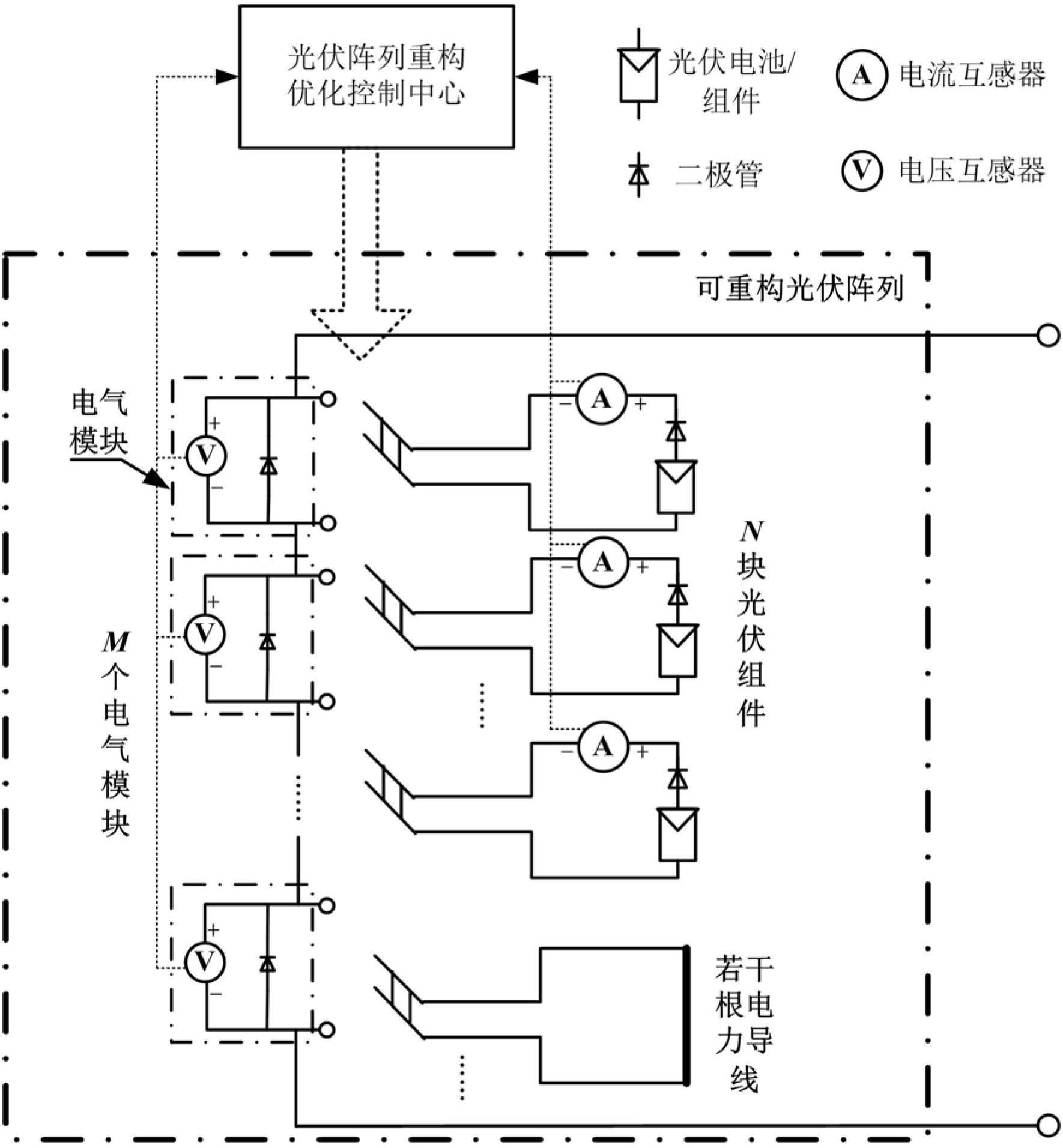 1.一种光伏电池阵列完全可重构电气系统的重构优化方法,其特征在于:所述电气系统包括完全可重构光伏阵列,所述完全可重构光伏阵列由M组电气模块串联而成,所述电气模块的两端接口并联光伏组件组或电力导线,每个光伏组件串联有一个防逆二极管和一个电流互感器,每个电气模块并联一个电压互感器;