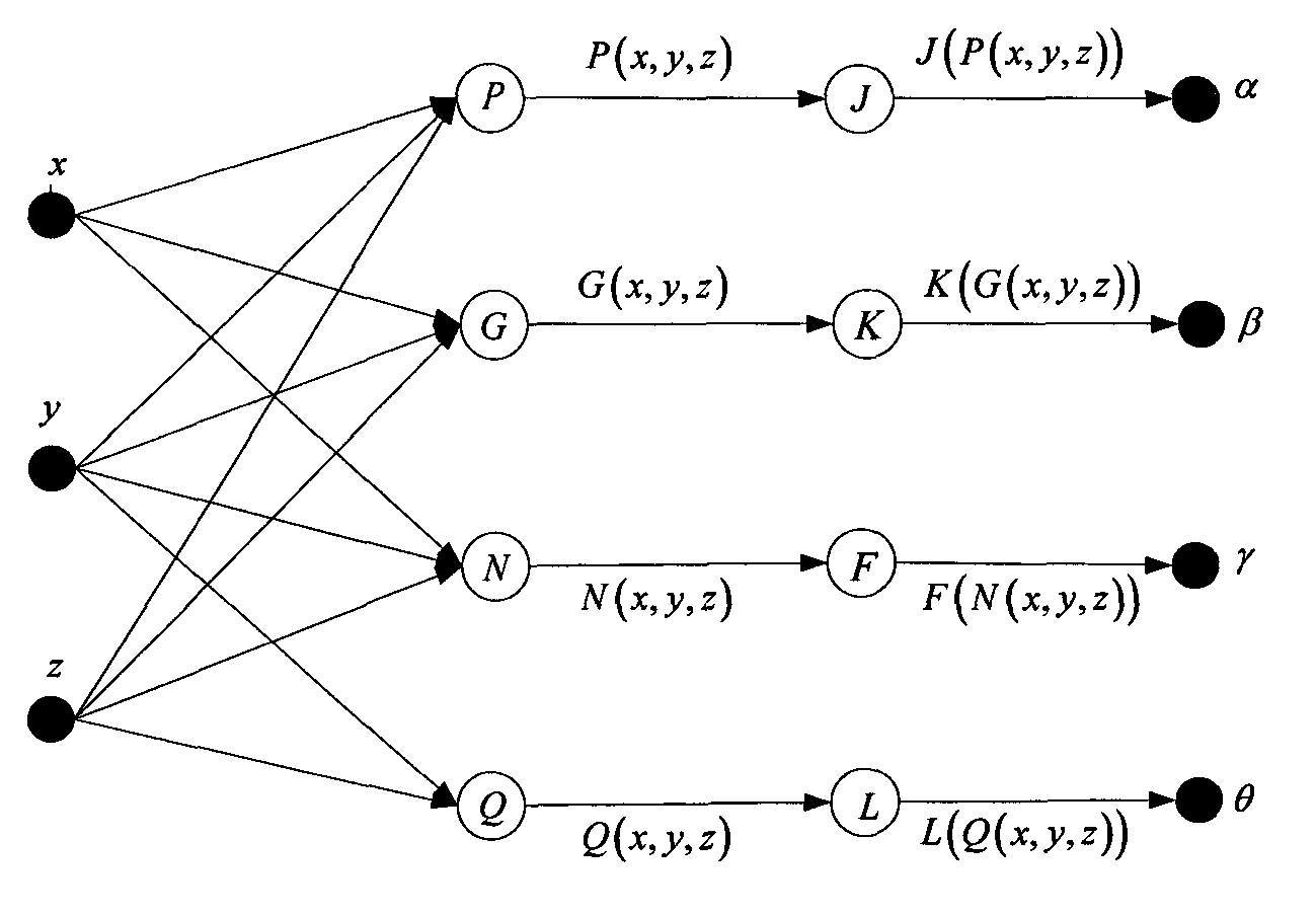 所述多输入多输出泛函网络模型包括有作为第一层的输入层,作为第一神经函数处理层的P,G,N,Q、作为第二神经函数处理层的J,K,F,L及输出层,该网络模型中同时还包括若干个中间存储单元层,所述中间存储单元层用于存储由第一层神经元产生的信息;首先赋予网络第一层神经函数的参数ci,当网络输入端进入一组信号W=[w1,w2,…,wN],这里w1,w2,…,wN为网络输入信号W的列向量,N为列向量的个数,所述列向量经过φ(wi),i=