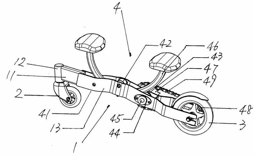 1.一种C形杆滚动摩擦动力两轮滑板,包括滑板主体、万向轮、后轮和驱动机构,其特征是:滑板主体包括前梁管、万向轮座和后架,前梁管的前端焊接万向轮座,前梁管的后端焊接后架,后架是两扁铁前部压制成弧形上抛、后部成叉形向外叉开,后架两扁铁的前部和中部有第一对穿孔、第二对穿孔和第三对穿孔这三对相互的对穿孔、第三对穿孔的两边还各有一螺纹孔,后架两扁铁的第二对穿孔的位置有圆弧形外抛,后架两扁铁圆弧形外抛的内侧各焊接一铁圈,后架焊接的两铁圈位于所述第二对穿孔的下方,后架两扁铁的后端有一对相互对应的豁口,后架两扁铁的后部焊接有一矩形铁片,万向轮拧接于万向轮座中,后轮连带着飞轮安装于后架的一对相互的豁口中,驱动机构包括第一滚筒、第二滚筒、第三滚筒、轴座、驱动轴、C形杆、链轮、飞轮和链条,第一滚筒和第二滚筒是一筒状塑料件中间的两端各镶嵌一轴承,第一滚筒通过对锁螺栓安装于后架的第一对穿孔中,两轴座通过螺栓对应安装于后架的第三对穿孔、并位于后架两扁铁的外侧,第三滚筒是金属轴套管中有螺纹、金属轴套管圆周包有橡胶的滚筒,第三滚筒的螺纹孔对应于安装在后架的两轴座,将驱动轴从右边轴座的轴承孔中穿入、拧入到第三滚筒的螺纹孔中、再穿入到左边轴座的轴承孔中,将链轮拧接于驱动轴的右端,将C形杆放置于第一滚筒和第三滚筒上,再将第二滚筒紧靠在C形杆上,C形杆包括弯曲成C形的矩形管、脚踏连片和塑料脚踏,脚踏连片是带孔的金属片,脚踏连片焊接于弯曲成C形的矩形管的两顶端,脚踏连片通过螺栓连接塑料脚踏,用螺栓和螺母配合、将第二滚筒安装于后架的第二对穿孔,链条绕接于链轮和飞轮上。