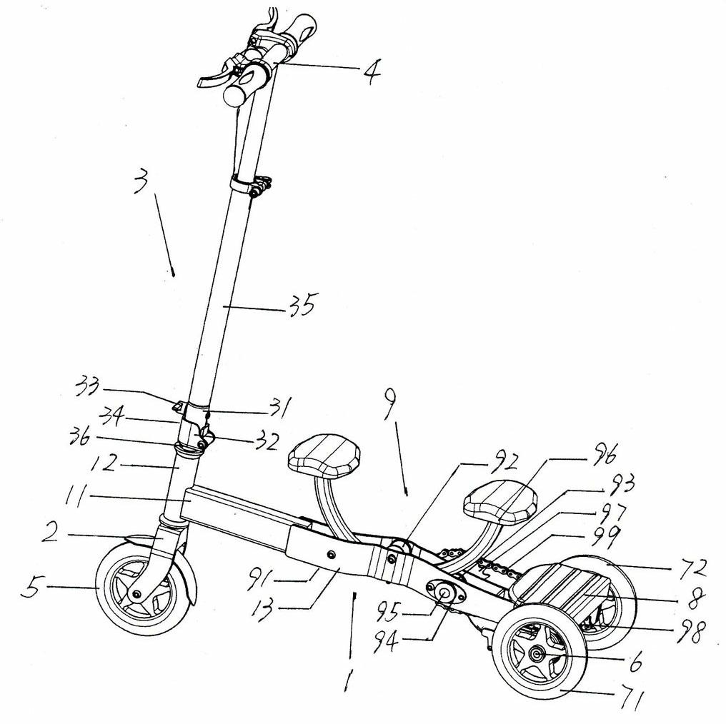 1.一种C形杆滚动摩擦动力三轮滑板车,包括车身、前叉、折叠把立管、手把、前轮、后轮轴、后轮、面板和驱动机构,其特征是:车身包括前梁管、前头管和车身后架,前梁管的前端焊接前头管,前梁管的后端焊接车身后架,车身后架是两扁铁前部压制成弧形上抛、后部成叉形向外叉开,车身后架两扁铁的前部和中部有第一对穿孔、第二对穿孔和第三对穿孔这三对相互的对穿孔、第三对穿孔的两边还各有一螺纹孔,车身后架两扁铁的第二对穿孔的位置有圆弧形外抛,车身后架两扁铁圆弧形外抛的内侧各焊接一铁圈,车身后架焊接的两铁圈位于所述第二对穿孔的下方,车身后架两扁铁的后端有一对相互对应的孔、孔中镶嵌有轴承,车身后架两后端孔中轴承,两边有金属冲片通过螺栓拧接定位,车身后架两扁铁的后部焊接有一矩形铁片,折叠把立管包括上部件、下部件、旋拧螺栓、内楔舌、把立管和内伸管,折叠把立管的上部件是下部焊接一圈形冲件的管形件,上部件的中部有一对穿孔、对穿孔的下方有一导孔、导孔位于圈形冲件的对面、对穿孔与圈形件垂向,上部件的上部连接把立管,下部件是一侧面成半圆兜、半圆兜开口的下部有两耳孔的冲压件,下部件的上部有一锁接孔,下部件的底部有一孔、孔中焊接内伸管,将对锁螺栓的螺筒穿入下部件的两耳孔和上部件圈形冲件的圈孔中,再用螺栓拧接于对锁螺栓的螺筒中定位,旋拧螺栓穿入上部件的对穿孔再拧入内楔舌的螺纹孔中,再用螺栓拧入旋拧螺栓一端的螺纹孔中定位,内楔舌是上部带螺孔、下部带斜钩的冲压件,内楔舌的斜钩滑行于上部件的导孔中、并锁接于下部件的锁接孔中;折叠把立管的内伸管通过吊紧螺栓和胀塞与前叉连接,手把成丁字形,手把通过管夹连接于折叠把立管的上端,前叉通过七件碗与前头管连接,前轮安装于前叉,后轮轴安装于车身后架两端的轴承孔中,后轮轴的中部安装飞轮,后轮轴的左端固定连接左后轮,后轮轴的右端转动连接右后轮,面板通过螺栓固定于车身后架的后部,驱动机构包括第一滚筒、第二滚筒、第三滚筒、轴座、驱动轴、C形杆、链轮、飞轮和链条,第一滚筒和第二滚筒是一筒状塑料件中间的两端各镶嵌一轴承,第一滚筒通过对锁螺栓安装于车身后架的第一对穿孔中,两轴座通过螺栓对应安装于车身后架的第三对穿孔、并位于车身后架两扁铁的外侧,第三滚筒是金属轴套管中有螺纹、金属轴套管圆周包有橡胶的滚筒,第三滚筒的螺纹孔对应于安装在车身后架的两轴座,将驱动轴从右边轴座的轴承孔中穿入、拧入到第三滚筒的螺纹孔中、再穿入到左边轴座的轴承孔中,将链轮拧接于驱动轴的右端,将C形杆放置于第一滚筒和第三滚筒上,再将第二滚筒紧靠在C形杆上,C形杆包括弯曲成C形的矩形管、脚踏连片和塑料脚踏,脚踏连片是带孔的金属片,脚踏连片焊接于弯曲成C形的矩形管的两顶端,脚踏连片通过螺栓连接塑料脚踏,用螺栓和螺母配合、将第二滚筒安装于车身后架的第二对穿孔,链条绕接于链轮和飞轮上。