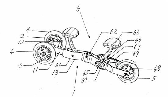 1.一种C形杆滚动摩擦动力三轮滑板,包括滑板主体、前轮座、连杆、前轮、后轮和驱动机构,其特征是:滑板主体包括纵梁管、横梁管和后架,纵梁管的前端焊接横梁管,纵梁管的后端焊接后架,横梁管是一矩形管的两头各垂直焊接一圆管,横梁管的两圆管孔通过对锁螺栓与两前轮座转动连接,前轮座是一槽型的金属冲件中间连接有一短轴,两前轮座的短轴上各连接一前轮,连杆的两头通过螺栓连接于两前轮座底面的后部,后架是两扁铁前部压制成弧形上抛、后部成叉形向外叉开,后架两扁铁的前部和中部有第一对穿孔、第二对穿孔和第三对穿孔这三对相互的对穿孔、第三对穿孔的两边还各有一螺纹孔,后架两扁铁的后端有一对相互对应的豁口,后架两扁铁的后部焊接有一矩形铁片,万向轮拧接于万向轮座中,后轮连带着飞轮安装于后架的一对相互的豁口中,驱动机构包括第一滚筒、第二滚筒、第三滚筒、轴座、驱动轴、C形杆、链轮、飞轮和链条,第一滚筒和第二滚筒是一筒状塑料件中间的两端各镶嵌一轴承,第一滚筒通过对锁螺栓安装于后架的第一对穿孔中,两轴座通过螺栓对应安装于后架的第三对穿孔、并位于后架两扁铁的外侧,第三滚筒是金属轴套管中有螺纹、金属轴套管圆周包有橡胶的滚筒,第三滚筒的螺纹孔对应于安装在后架的两轴座,将驱动轴从右边轴座的轴承孔中穿入、拧入到第三滚筒的螺纹孔中、再穿入到左边轴座的轴承孔中,将链轮拧接于驱动轴的右端,将C形杆放置于第一滚筒和第三滚筒上,再将第二滚筒紧靠在C形杆上,用螺栓和螺母配合、将第二滚筒安装于后架的第二对穿孔,链条绕接于链轮和飞轮上。