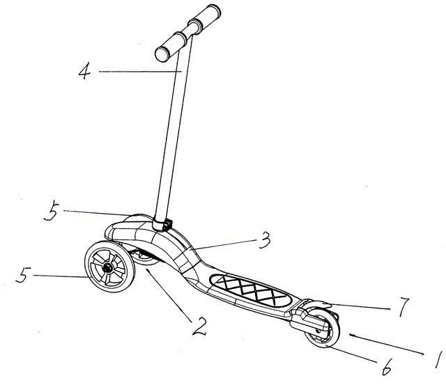 6.根据权利要求1所述的摆把拐弯式滑板车,其特征是:所述的前轮和所述的后轮,是塑料轮毂的PU轮、中间的两侧各镶嵌一轴承,所述的后轮通过对锁螺栓连接于所述后叉两后端的对穿孔中。