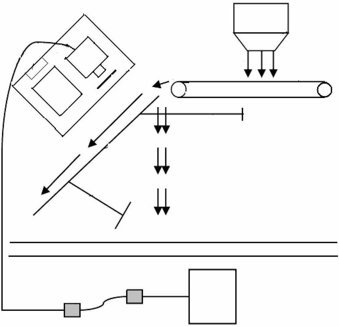 自动控制装置:所述自动控制装置包括电源(12)、计算机(10)、第一编码器(11)和第二编码器(15),其中,第一编码器(11)安装在二级传送带(4)转轴上,第二编码器(15)安装在防尘稳固箱(5)上,且连接面阵相机(7);所述激光器(6)、面阵相机(7)、第一编码器(11)和第二编码器(15)分别连接计算机(10);所述电源(12)连接计算机(10)。