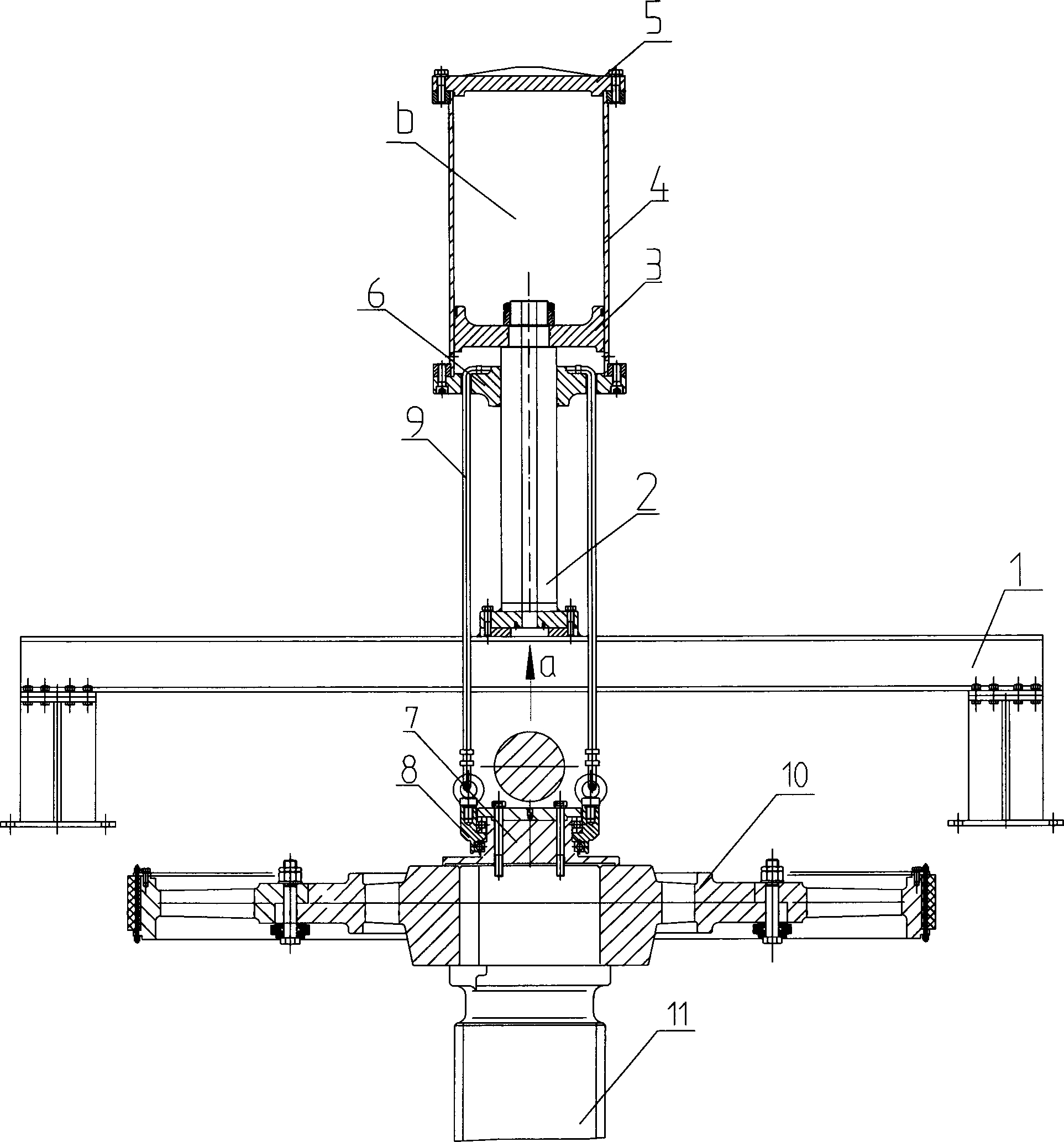 1.一种摩擦螺旋压力机提升机构,其特征在于,包括支架,一端安装在支架上并带有中心孔的立式活塞杆,立式活塞杆另一端连接的活塞,安装在活塞上的气缸缸体,安装在气缸缸体上端的顶盖,安装在气缸缸体下端的底盖,安装在压力机飞轮上端面中部上的轴承座,安装在轴承座上的轴承体,悬挂在气缸底盖上、且两端与轴承体相连的悬挂钢绳。