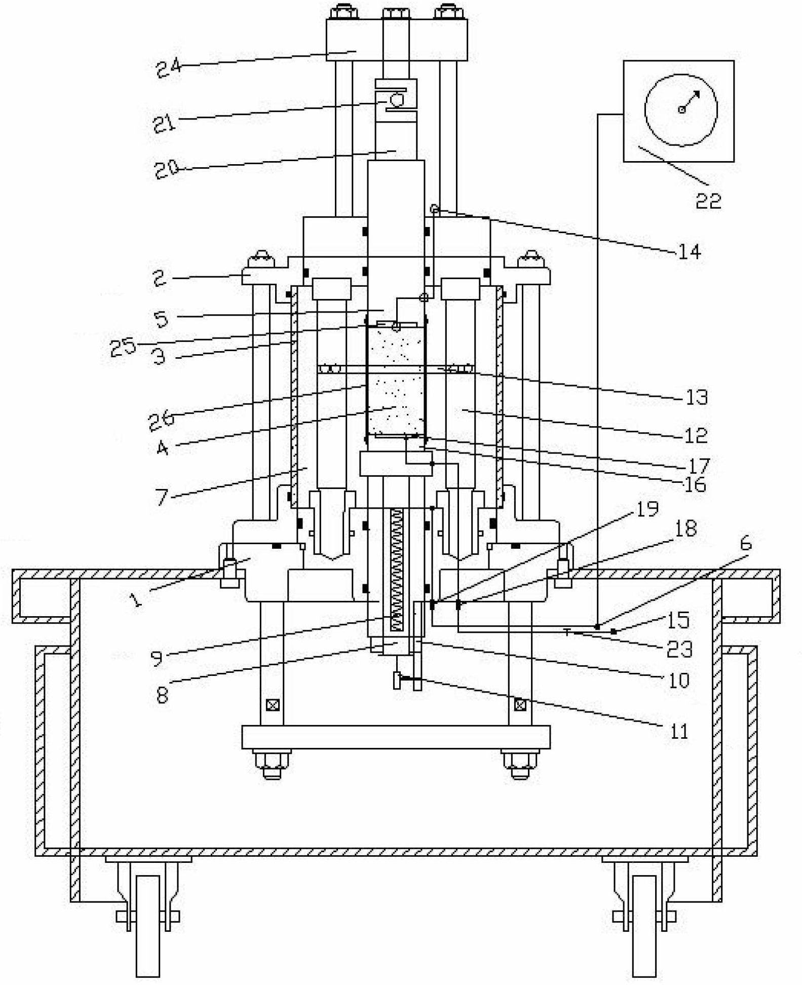 橡皮膜(26)的上端面设置有试样帽(5),橡皮膜(26)与试样帽(5)之间还设置有上排气板(25),上排气板(25)与试样帽(5)共同设置有排气通道(14);试样帽(5)向上与竖向传力轴(20)连接,轴向传力杆(20)上安装有轴向压力传感器(21),竖向传力轴(20)向上与主体支架(24)连接。