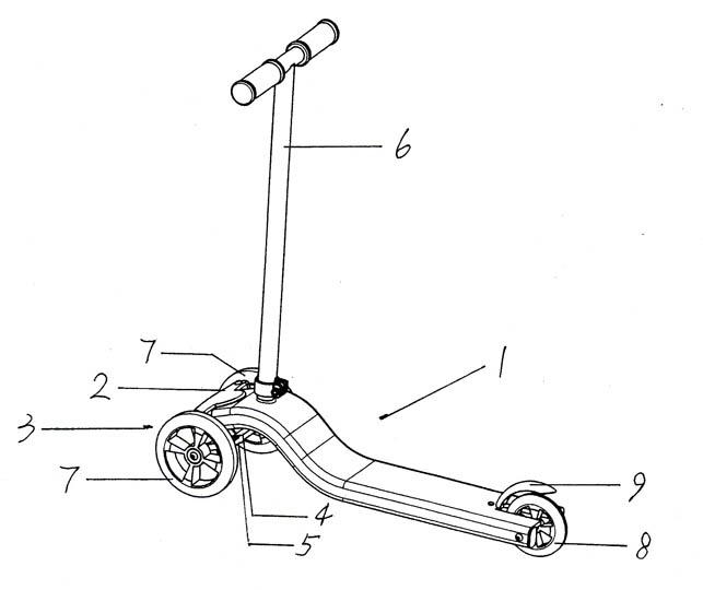 6.根据权利要求1所述的铝型材和塑料结合的摆把拐弯式滑板车,其特征是:所述的前轮和所述的后轮,是塑料轮毂的PU轮、中间的两侧各镶嵌一轴承,两所述的前轮套接于左、右转向件的所述金属圆杆件的横杆上,并用两螺栓拧接于左、右转向件的所述金属圆杆件横杆外端的螺纹孔中定位,所述的后轮通过对锁螺栓连接于所述型材车梁两管形后端相互的对穿孔中。