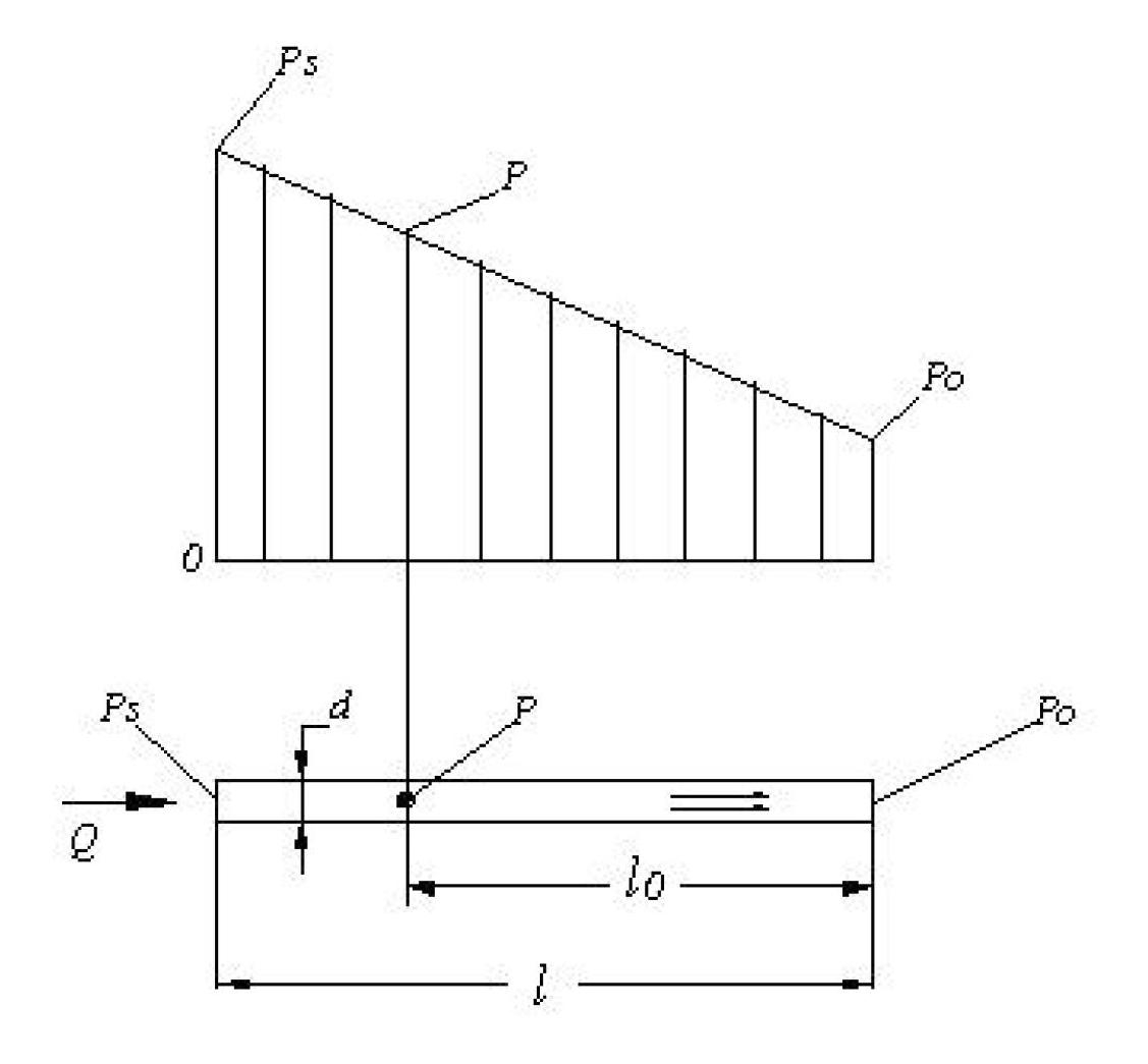 流体层流实现机构包括阀芯和阀套,所述的阀套上设置进油口、第一出油口和第二出油口,所述的进油口设置在所述的第一出油口和第二出油口之间;所述的阀芯的两端设置与阀套的内径匹配的工作台阶;所述的阀芯的工作台阶和阀套的间隙连通进油口、第一出油口和第二出油口,所述的间隙为层流层流道,在所述的间隙中流体流动呈现层流流态,进油口和第一出油口、第二出油口的压力分布呈现稳定的线性分布;