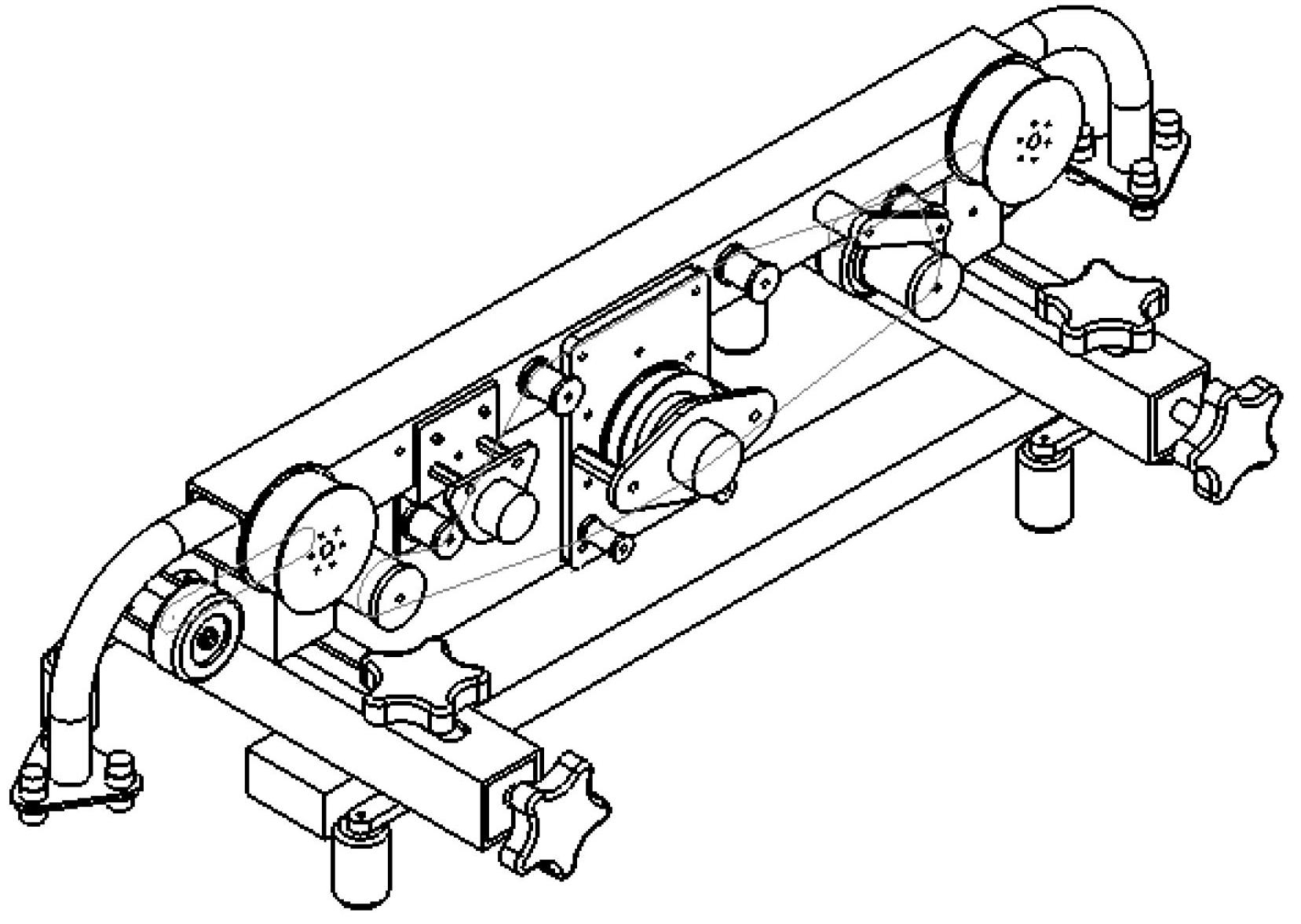 车架的两个端口均通过螺丝分别与管架的一端相连接,管架的另一端设置有边缘传感器底座,边缘传感器底座上安装有多个边缘传感器;车架下表面的两个端口边缘均与车架杆的一端相连接,车架的一个侧面上设置有升降电机装置底座,升降电机装置底座上安装有升降电机装置,同时设置有第二齿轮组,第二齿轮组包括第五齿轮和第六齿轮;第一齿轮组安装在车架上,包括第一齿轮、第二齿轮、第三齿轮、第四齿轮,其中第二齿轮、第三齿轮设置在升降电机装置底座的两侧;驱动电机装置底座设置在第二齿轮的另一侧,且驱动电机装置底座上安装有驱动电机装置和第一齿轮,第三齿轮、第四齿轮中间设置有杆底座,杆底座上安装有连接杆;两个操纵缆绳绕线轴分别安装在车架一个侧面的两个端口边缘,两个操纵缆绳绕线轴安装侧面与第一齿轮组、第二齿轮组同一侧面;两个车架杆中间均设置有驱动轮架,驱动轮架的两端分别安装有驱动轮,驱动轮上设置驱动齿轮,且驱动轮、驱动轮架与驱动齿轮同轴安装,驱动链经过驱动轮架跨绕两个驱动齿轮;车架杆的另一端与夹紧杆的一端相连接,夹紧杆的另一端设置有夹紧盖,夹紧装置水平调整旋钮的一端穿过夹紧盖的通孔,进入夹紧杆内;夹紧装置垂直调整旋钮的一端穿过弹簧滑块上的通孔,进入夹紧杆上表面的滑槽;两个夹紧轮安装于夹紧轮架的两端,四组夹紧轮架装配在夹紧杆下表面;夹紧装置垂直调整旋钮、弹簧滑块与夹紧轮架同轴线;夹紧杆安装在车底座上面。