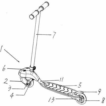 4.根据权利要求1所述的前万向轮式摆把拐弯两轮滑板车,其特征是:所述的踏板可以是木质多层夹板制成,也可以是塑料注塑而成。`