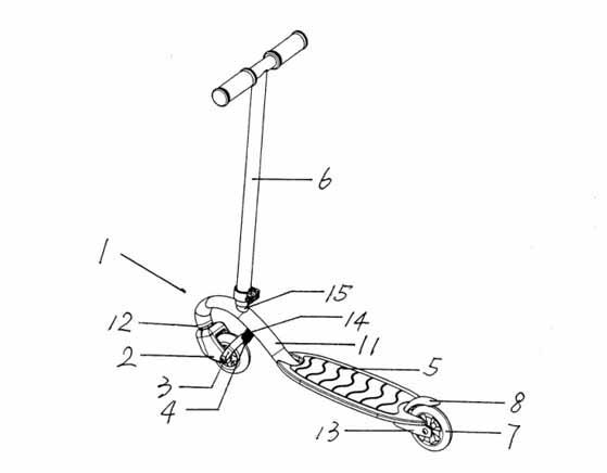 3.根据权利要求1所述的“?”形弯曲摆把拐弯式两轮滑板车,其特征是:所述的万向轮是塑料轮叉的万向轮,包括轮叉、两轮叉轴承、一轮叉螺栓、一螺母、一对锁螺栓和一孔心带两轴承的PU轮,所述的轮叉是塑料轮叉,所述轮叉顶部的上下各有一沉孔,所述轮叉的上下沉孔之间有一贯通孔,所述轮叉下端的两轮叉上有相互的对穿孔,所述轮叉两轮叉上的相互对穿孔的孔心连线与所述轮叉上下两沉孔的中心线相垂直,所述轮叉两轮叉上的相互对穿孔的孔心连线与所述轮叉上下两沉孔的中心延长线相距3~4公分,所述的轮叉两轮叉上的相互对穿孔的里端各有一凸圈,所述轮叉的上下沉孔中各镶嵌一轮叉轴承,两所述轮叉轴承的内孔中穿入一轮叉螺栓,穿入两所述轮叉轴承内孔中的一轮叉螺栓上拧接一螺母,所述万向轮顶部的轮叉螺栓与所述的螺母拧接,两所述的轮叉轴承是普通的滚珠轴承。