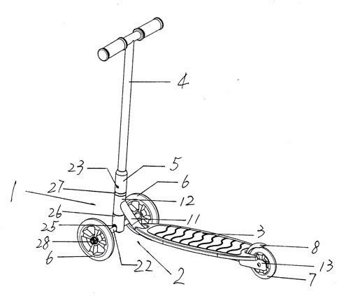 7.根据权利要求1所述的前两轮避震式滑板车,其特征是:所述的前轮和所述的后轮,是塑料轮毂的PU轮,所述前轮和所述后轮中间的两侧各镶嵌一轴承,所述的后轮通过对锁螺栓连接于所述后叉两后端的对穿孔中。