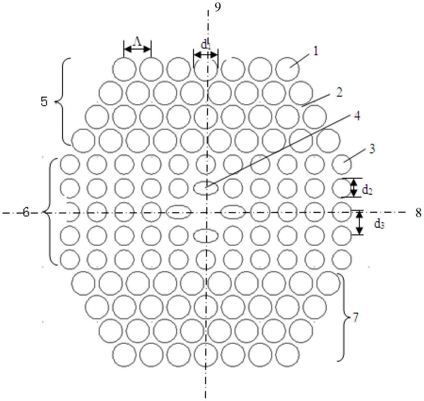 1.一种双折射光子晶体光纤,沿所述的光纤轴向有规律地排列着许多空气孔道,所述的空气孔道沿光纤轴线平行排列,所述光纤的横截面上空气孔在光纤背景材料上分别沿纵向中心轴、横向中心轴对称布置,所述的横截面包括纤芯和包层,所述的包层为包围所述纤芯的分布着空气孔的外围区域,其特征在于:所述包层中空气孔沿纵向中心轴由上而下分隔成上层、中间层和下层形成的三明治结构排列,所述上层、下层的大空气孔大小相同,所述大空气孔均匀分布在光纤背景材料中且呈周期性排列,相邻排的大空气孔相互错位,间隔排的大空气孔相互对准,每相邻的三个大空气孔构成正三角形;所述中间层的小空气孔大小相同,所述的小空气孔的直径小于大空气孔的直径,所述的小空气孔在光纤背景材料中呈均匀的矩阵排列,所述矩阵的总排数和总列数都成单数,中间列的小空气孔圆心都布置在所述的纵向中心轴上,中间行的小空气孔圆心都布置在所述的横向中心轴上;所述纵向中心轴与所述横向中心轴相交的小空气孔位置被实心材料所替代构成所述纤芯,布置在纵向中心轴上紧挨着纤芯的两个小空气孔以及布置在横向中心轴上紧挨着纤芯的两个小空气孔分别各自由相同大小的椭圆形空气孔替代,所述椭圆形空气孔的长直径与横向中心轴平行或重叠。