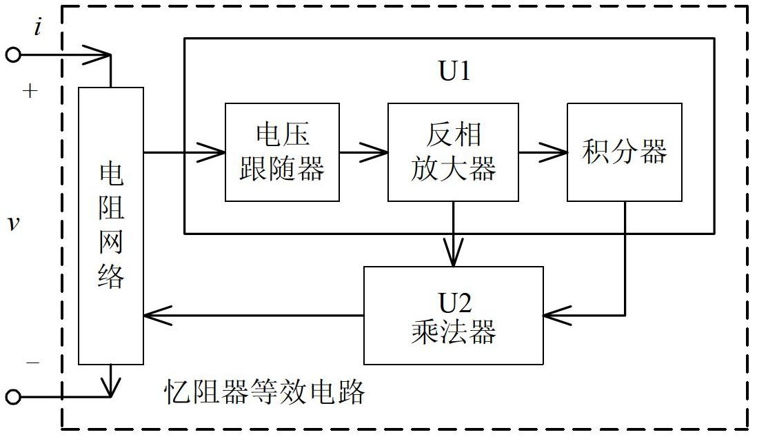 4.根据权利要求3所述的忆阻器等效模拟电路,其特征在于:所述集成运算放大器U1的第1引脚与第2引脚短接,第4引脚接电源VCC,第11引脚接电源VEE;所述集成运算放大器U1的第1引脚通过电阻R2与第6引脚相连,第5引脚接地,第6引脚通过电阻R3接第7引脚,第7引脚通过电阻R6接第9引脚;第8引脚通过电容C1与第9引脚相连;第10引脚接地;第12、13、14引脚悬空。
