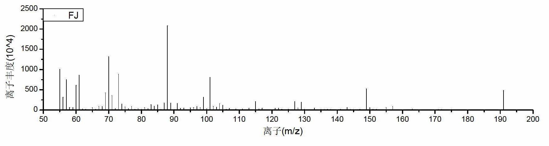 c、上述供试样品由气相色谱仪得到的色谱图经NIST 05质谱库Agilent Technologies Inc.分析,导出三维数据,获得不同产地白酒酒样质荷比m/z 55~191范围内的离子丰度值数据,得离子丰度质谱图;