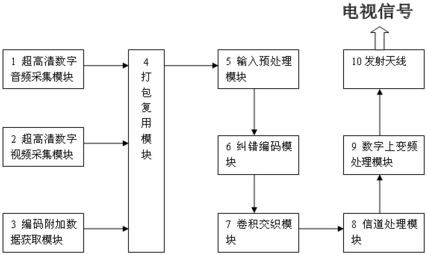 超高清数字音频采集模块、超高清数字视频采集模块、编码附加数据获取模块、打包复用模块、输入预处理模块、纠错编码模块、卷积交织模块、信道处理模块、数字上变频处理模块,打包复用模块与超高清数字音频采集模块、超高清数字视频采集模块、编码附加数据获取模块连接以分别接收压缩音频数据、压缩音频数据和编码附加数据并进行打包复用,输入预处理模块、纠错编码模块、卷积交织模块、信道处理模块、数字上变频处理模块依次连接以对打包复用模块输出的TS流依次进行输入预处理、纠错编码、卷积交织、信道处理和数字上变频处理,获得发射机发射天线发射所需的射频信号;