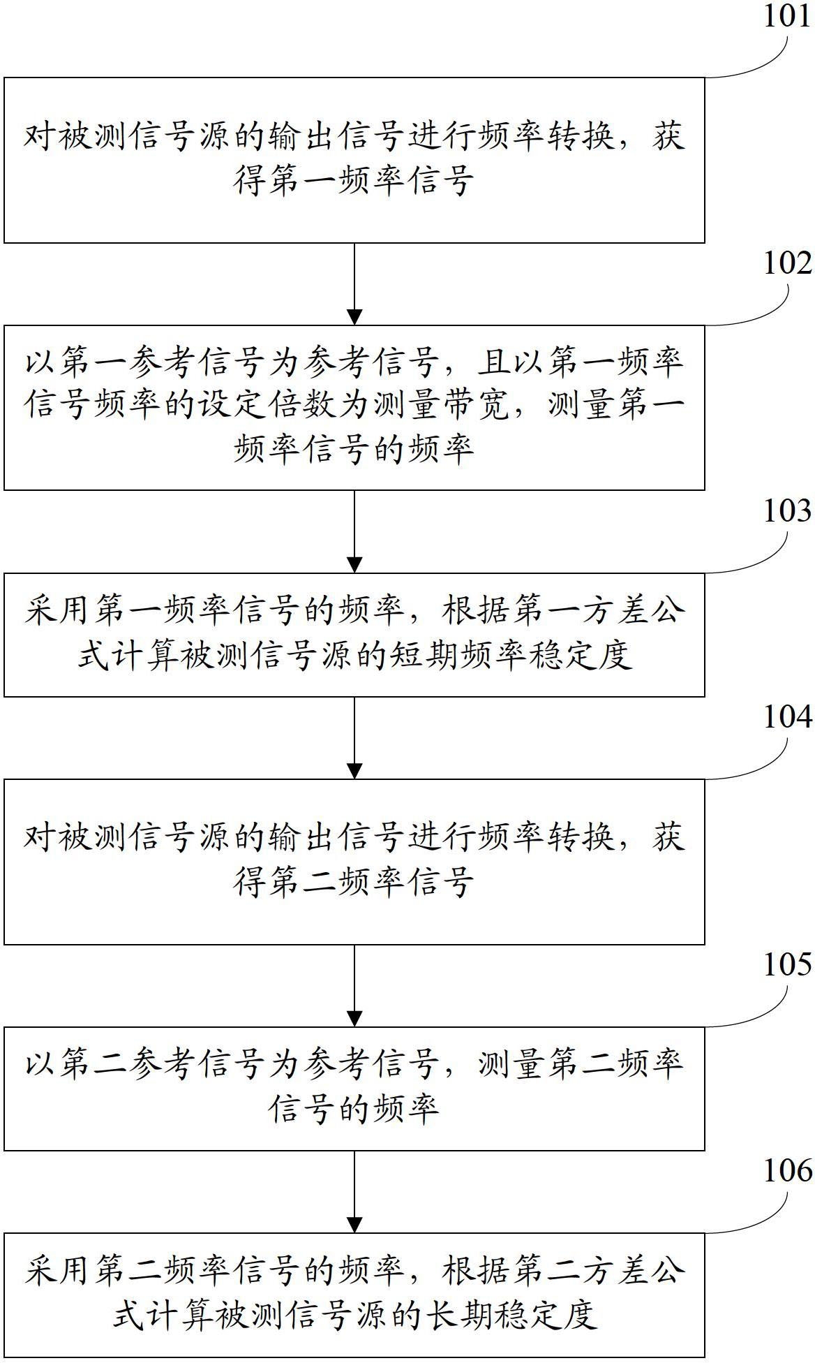 用于以第二参考信号为参考信号,测量所述第二频率切换模块获得的所述第二频率信号的频率的第二测量模块;以及用于采用所述第一测量模块测得的所述第一频率信号的频率,根据第一方差公式确定所述被测信号源的短期频率稳定度,采用所述第二测量模块测得的所述第二频率信号的频率,根据第二方差公式确定所述被测信号源的长期频率稳定度的处理模块;