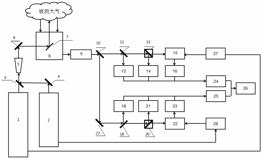 532nm/1064nm二相色分光镜a、扩束器、反射镜b和反射镜c;接收系统a包括望远镜、光学滤波器、532nm/1064nm二相色分光镜b、分光镜a、光电探测器a、偏振分光棱镜a、光电探测器b、高光谱分辨率滤光器a、光电探测器c;锁频系统a将高光谱分辨率滤光器a锁频至