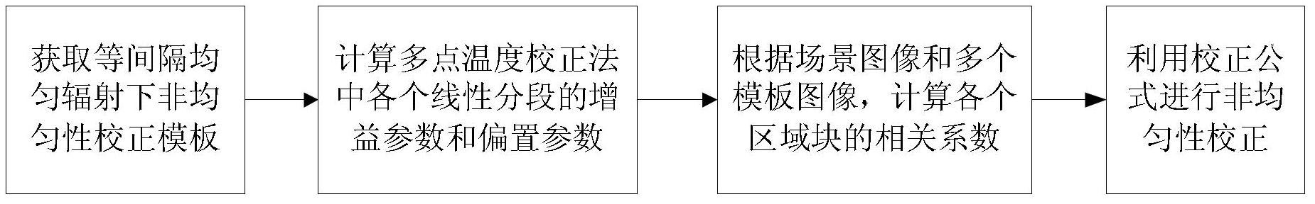 101、在均匀标准参考面源的辐射下,采集红外焦平面阵列IRFPA在至少两个不同温度点的红外图像作为模板,模板图像对应探测单元的响应Vij(φ),其中:φ为均匀辐射通量,i、j分别为红外焦平面阵列探测单元的横坐标和纵坐标;
