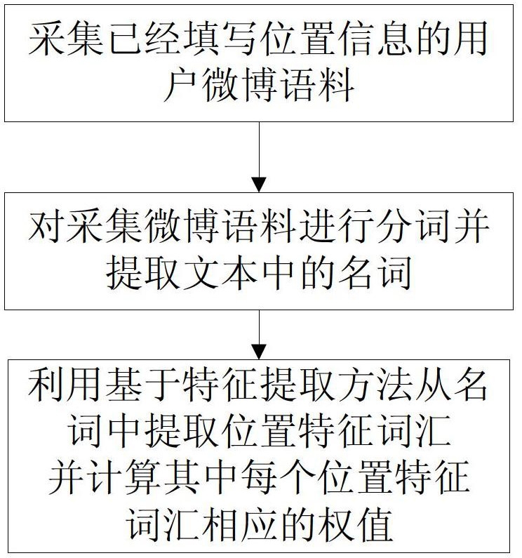 所述的微博语料是指用户发布的原创微博文本和用户转发微博时做出的评论,不包括用户转发的原始微博;所采集到的微博语料指已经填写具体位置信息的每一位用户最近发布的微博。