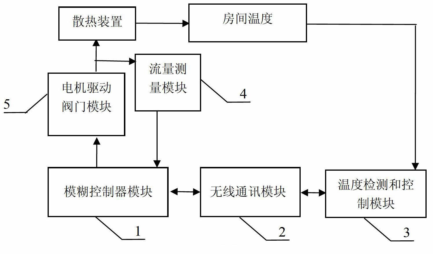 1.基于模糊控制算法的热计量无线温度控制系统,包括,依次相连的模糊控制器模块、温度检测和控制模块、无线通讯模块、电机驱动阀门模块和流量测量模块,其特征在于:温度检测和控制模块实时检测室内温度、进行温度设定和热能量消耗的查询和显示,并将实时检测的温度数据输出至无线通讯模块;无线通讯模块不仅将实时检测的温度数据输出给模糊控制器模块,而且将模糊控制器里保存的热量数据传输给温度检测和控制模块,以便进行显示,供用户查询,实现记录热量等信息的功能;模糊控制器模块根据输入的室内实际温度信号,利用模糊控制算法进行计算,将输出的阀门开度信号输出至电机驱动阀门模块,驱动电机工作,控制散热装置的阀门开度,从而控制供暖热水流量达到控制室内温度的目的;流量测量模块用以测量热量消耗值,并将热量值输出给模糊控制器模块,以便借助于无线通讯模块,将热量在温度检测和控制模块中记录下来,从而在实现对温度控制的同时,实现记录热量等信息的功能,用以控制阀门开度的所述的模糊控制器模块的控制方式如下: