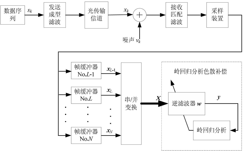 1.一种基于岭回归分析的相干光通信色散补偿方法,其特征在于,包括以下步骤:(1)光通讯系统中分集光接收机接收到信号光和本振激光器产生的本振光经过混频后,形成的叠加光场经光探测器转换为光电流信号,该光电流信号经相关处理后输出基带信号;标记接收端实现色散补偿的均衡器的输出信号为 , ,其中是均衡器向量;