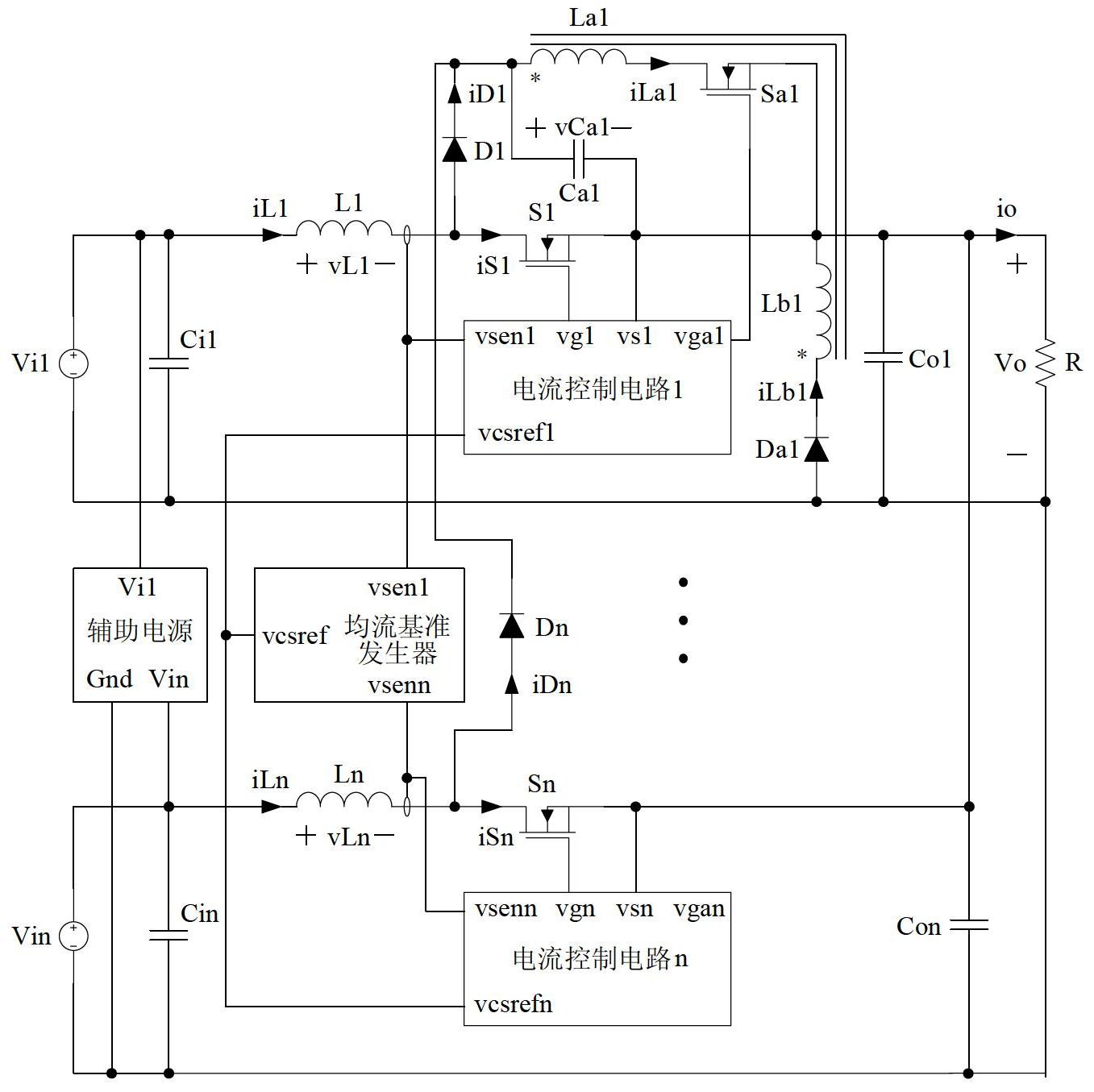 所述功率主回路由完整通道电路1和简化通道电路k(k=2,…,n)组成,所述完整通道电路1包括输入电容Ci1、电感L1、N-MOS主管S1、N-MOS辅助管Sa1、辅助电容Ca1、耦合电感La1和Lb1、二极管D1、辅助二极管Da1、输出电容Co1,直流电源Vi1的正端与输入电容Ci1的一端以及电感L1的一端相连,电感L1的另一端与二极管D1的阳极以及N-MOS主管S1的漏极相连,二极管D1的阴极与耦合电感La1的一端以及辅助电容Ca1的一端相连,耦合电感La1的另一端与N-MOS辅助管Sa1的漏极相连,N-MOS主管S1的源极与辅助电容Ca1的另一端、N-MOS辅助管Sa1的源极、耦合电感Lb1的一端(与所述耦合电感La1的另一端是同名端关系)、输出电容Co1的一端、输出电压Vo的正端以及负载R的一端相连,耦合电感Lb1的另一端(与所述耦合电感La1的一端是同名端关系)与辅助二极管Da1的阴极相连,辅助二极管Da1的阳极与直流电源Vi1的负端、输入电容Ci1的另一端、输出电容Co1的另一端、输出电压Vo的负端以及负载R的另一端相连,耦合电感Lb1与辅助二极管Da1的接点和耦合电感La1与二极管D1的接点是同名端关系,所述简化通道电路k(k=2,…,n)包括输入电容Cik、电感Lk、N-MOS主管Sk、二极管Dk、输出电容Cok,所述直流电源Vik的正端与输入电容Cik的一端以及电感Lk的一端相连,电感Lk的另一端与二极管Dk的阳极以及N-MOS主管Sk的漏极相连,二极管Dk的阴极与所述完整通道电路1中的二极管D1的阴极相连,N-MOS主管Sk的源极与输出电容Cok的一端、输出电压Vo的正端以及负载R的一端相连,直流电源Vik的负端与输入电容Cik的另一端、输出电容Cok的另一端、输出电压Vo的负端以及负载R的另一端相连,所述控制回路由电流控制电路1至电流控制电路n和均流基准发生器组成,所述电流控制电路j(j=1,…,n)拥有端口vsenj、端口vgj、端口vsj、端口vgaj、端口vcsrefj,所述均流基准发生器拥有端口vsenj和端口vcsref,所述电流控制电路1的端口vsen1接收所述电感L1的电流iL1的检测信号,电流控制电路1的端口vg1与所述N-MOS主管S1的门极相连,电流控制电路1的端口vs1与N-MOS主管S1的源极以及所述N-MOS辅助管Sa1的源极相连,电流控制电路1的端口vga1与N-MOS辅助管Sa1的门极相连,电流控制电路1的端口vcsref1与所述均流基准发生器的端口vcsref相连,所述均流基准发生器的端口vsen1接收所述电感L1的电流iL1的检测信号,所述简化通道电路k(k=2,…,n)与所述电流控制电路k相连,所述电流控制电路k的端口vsenk接收所述电感Lk的电流iLk的检测信号,所述电流控制电路k的端口vgk与所述N-MOS主管Sk的门极相连,所述电流控制电路k的端口vsk与所述N-MOS主管Sk的源极相连,所述电流控制电路k的端口vgak悬空,所述电流控制电路k的端口vcsrefk与所述均流基准发生器的端口vcsref相连,所述均流基准发生器的端口vsenk接收所述电感Lk的电流iLk的检测信号,所述辅助电源能为所述控制回路提供所需的工作电压,拥有端口Vij(j=1,…,n)和端口Gnd,所述辅助电源的端口Vij与所述直流电源Vij的正端相连,所述辅助电源的端口Gnd与所述直流电源Vij的负端相连。